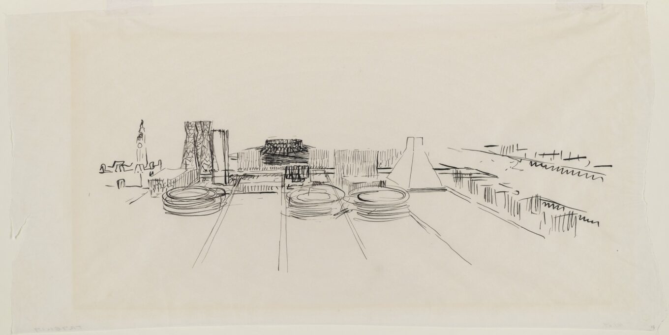 Луис Кан. Эскиз проекта административно-общественного центра Филадельфии, Пенсильвания, 1956-1957 гг. Перспектива с высоты птичьего полета,чернила на кальке. Экспонат музея MoMA в Нью-Йорке. © 2019 Estate of Louis I. Kahn