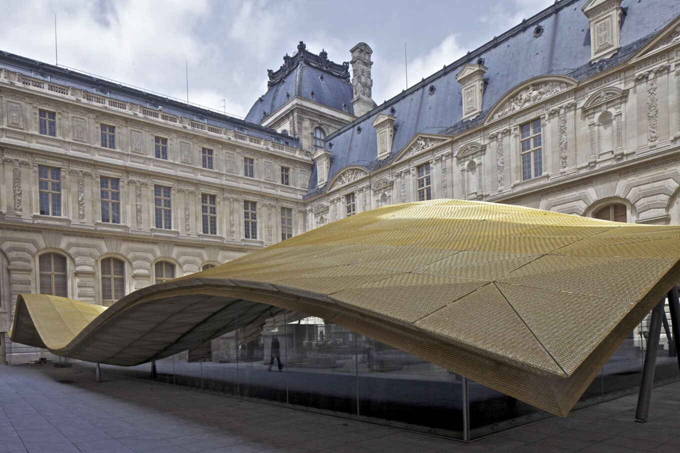 Архітектурний проєкт нового крила Лувру розробив Маріо Белліні та Руді Річотті. Вони розташували його у дворі Вісконті, зробивши два рівні, надземний і підземний. Структура накрита ажурним перекриттям із 8 000 сталевих трубок. Зверху — скляні панелі та позолочена алюмінієва сітка. Знизу — алюмінієві сонцезахисні екрани та ще один шар позолоченої сітки. Так у 2012 році з’явився новий павільйон Лувру загальною площею 6 800 кв. м із зовнішніми скляними стінами та хвилеподібним куполом, що нагадує піщані дюни.