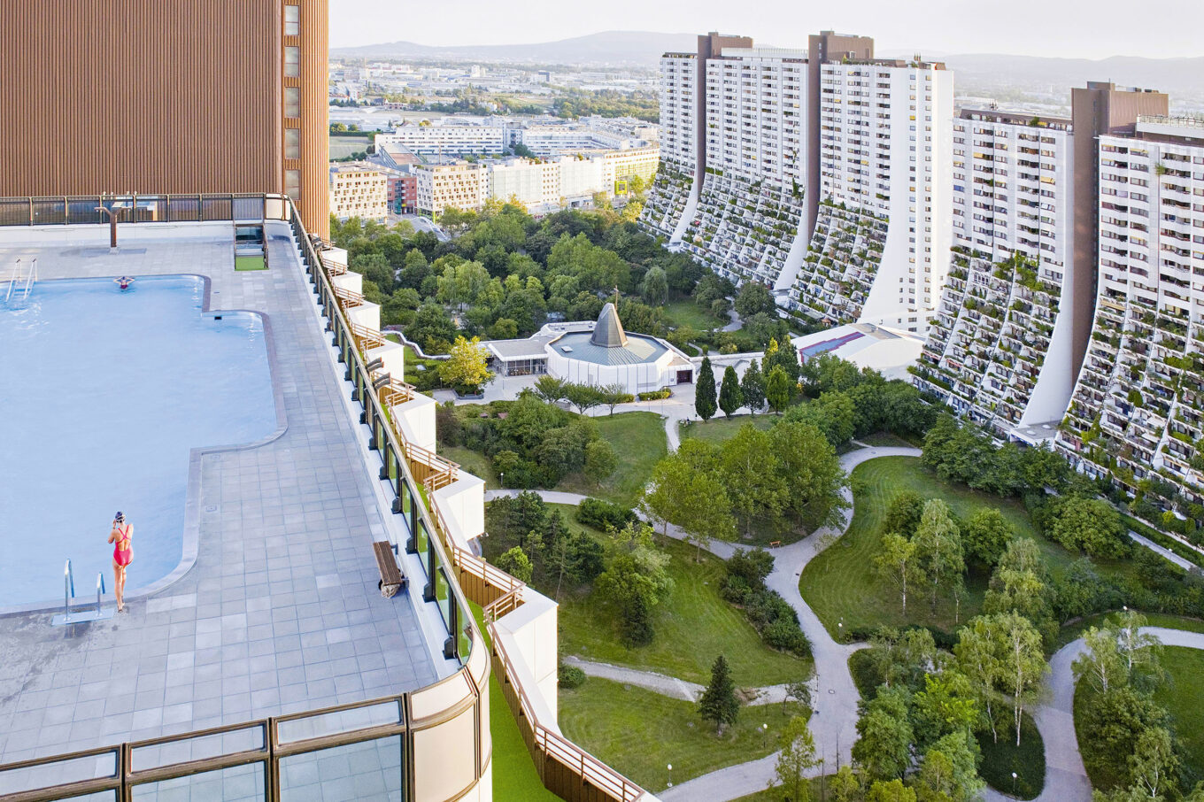 На вершині кожного із 27-поверхових каскадних блоків муніципального житлового комплексу Alt-Erlaa знаходиться відкритий басейн. Джерело фото: i.pinimg.com