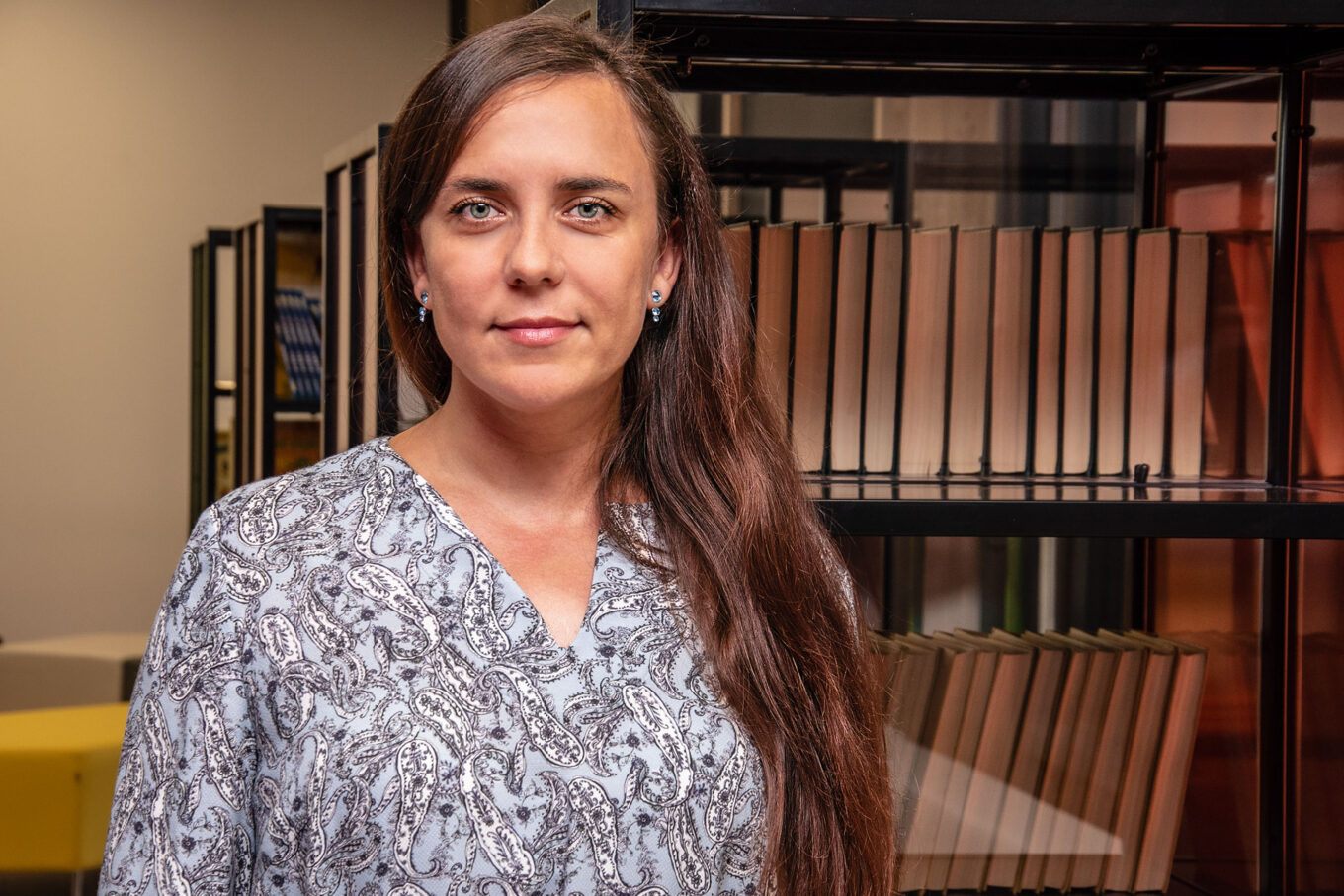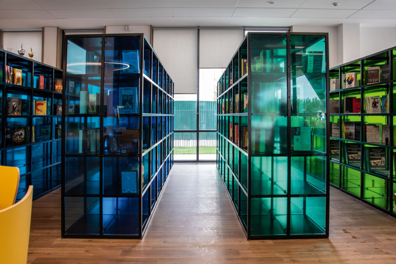 Библиотека гимназии «А+» с яркими стеллажами может использоваться как камерное пространство для лекций