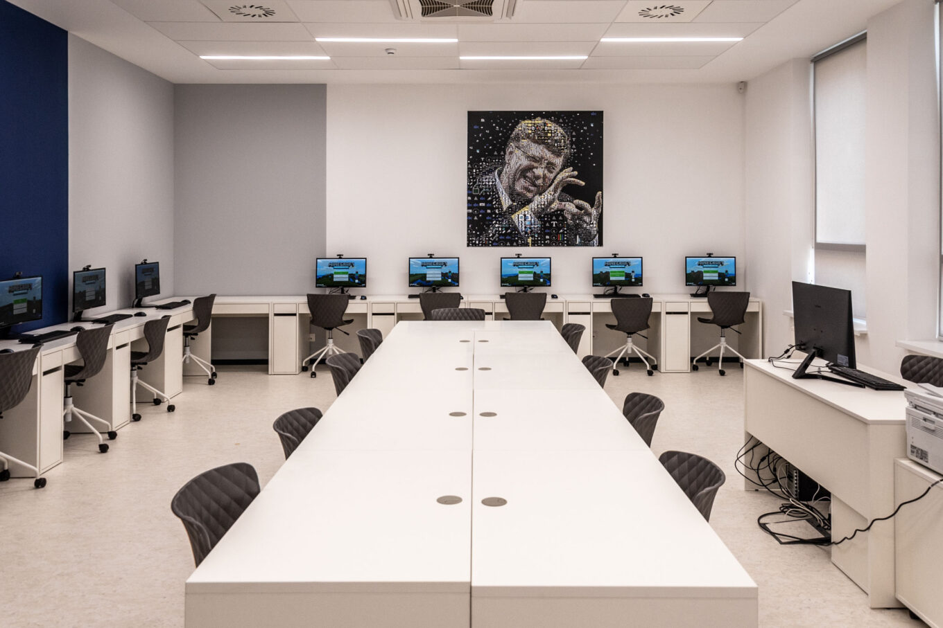 Т. К.: Все помещения школы — это кирпичики единой концепции, они дополняют друг друга. Предмет моей особой гордости — учительская. Просторная, на 250 кв. м, она сформирована по принципу open-space. У каждого преподавателя есть отдельное полноценное рабочее место. Выделена общая зона отдыха, укомплектованная кофе-машиной, холодильником, удобными диванами. Я педагог и как никто знаю, что профессия учителя сопряжена с большими психоэмоциональными затратами. А здесь преподаватель может почувствовать себя максимально комфортно.