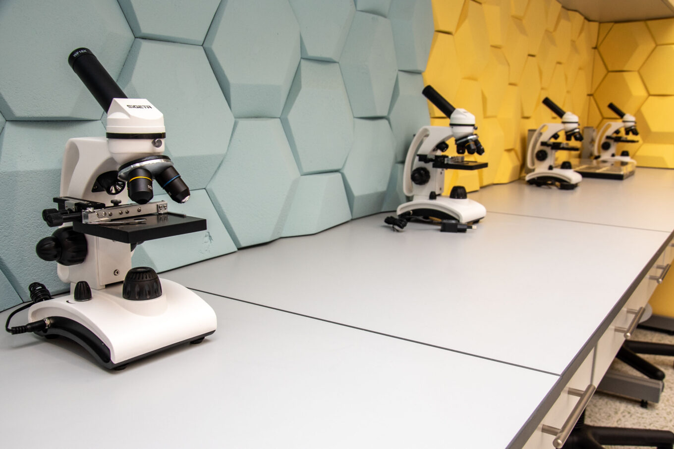 Отделочные материалы должны были соответствовать специфическим требованиям, которые мы предъявляем к школьному учреждению. Например, потолки. Они лишь выглядят обычными, но обратите внимание: даже в холле нет эха благодаря шумопоглощающему эффекту панелей. Мы выяснили, что, оказывается, есть результаты научного исследования, согласно которому, многие учителя к 40 годам страдают ларингитом из‑за фонового шума в классе: звук отражается от пола или потолка, заставляя учителя постоянно повышать голос. Применение акустических материалов подавляет этот фоновый шум. В классе тишина, даже если кто‑то шуршит, шепчет — и учитель меньше напрягает связки.