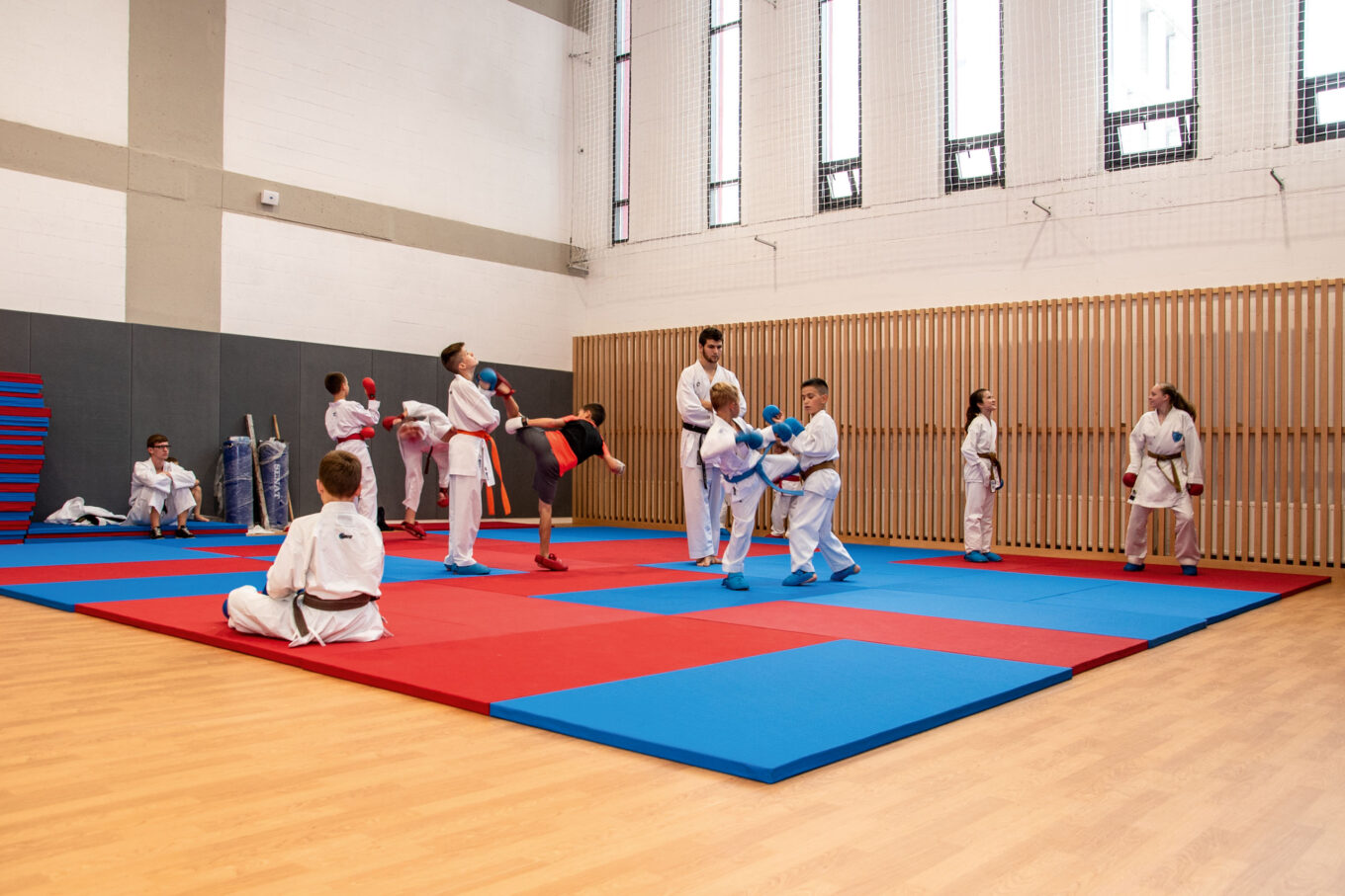 Алексей Мартыненко: Поскольку занятия в гимназии не ограничиваются обычной физзарядкой и спортом мы будем заниматься по расширенной программе, то прежде всего уделили особое внимание безопасности наших учащихся. Для беговых дорожек использовано специальное пружинистое покрытие, которое не допускает травм. Покрытие беговых дорожек соответствует стандарту IAAF (International Association of Athletics Federations). В спортивном зале вы можете увидеть на стенах мягкие панели-амортизаторы, которые смягчают удар о стену, если кто‑то в азарте игры вдруг вылетает за пределы поля.