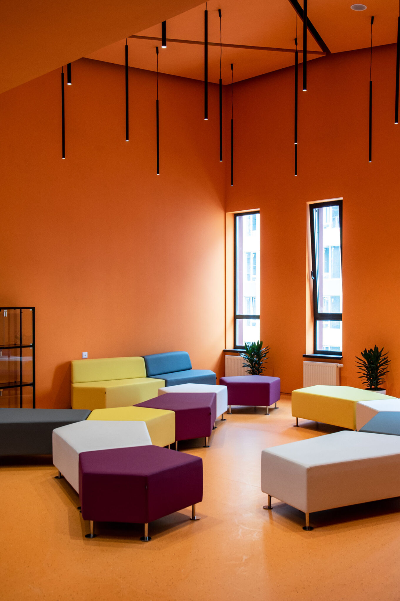 Интерьерная находка от SVOYA studio: на каждом этаже гимназии «А+» предусмотрена яркая рекреационная зона, оборудованная модульной мебелью