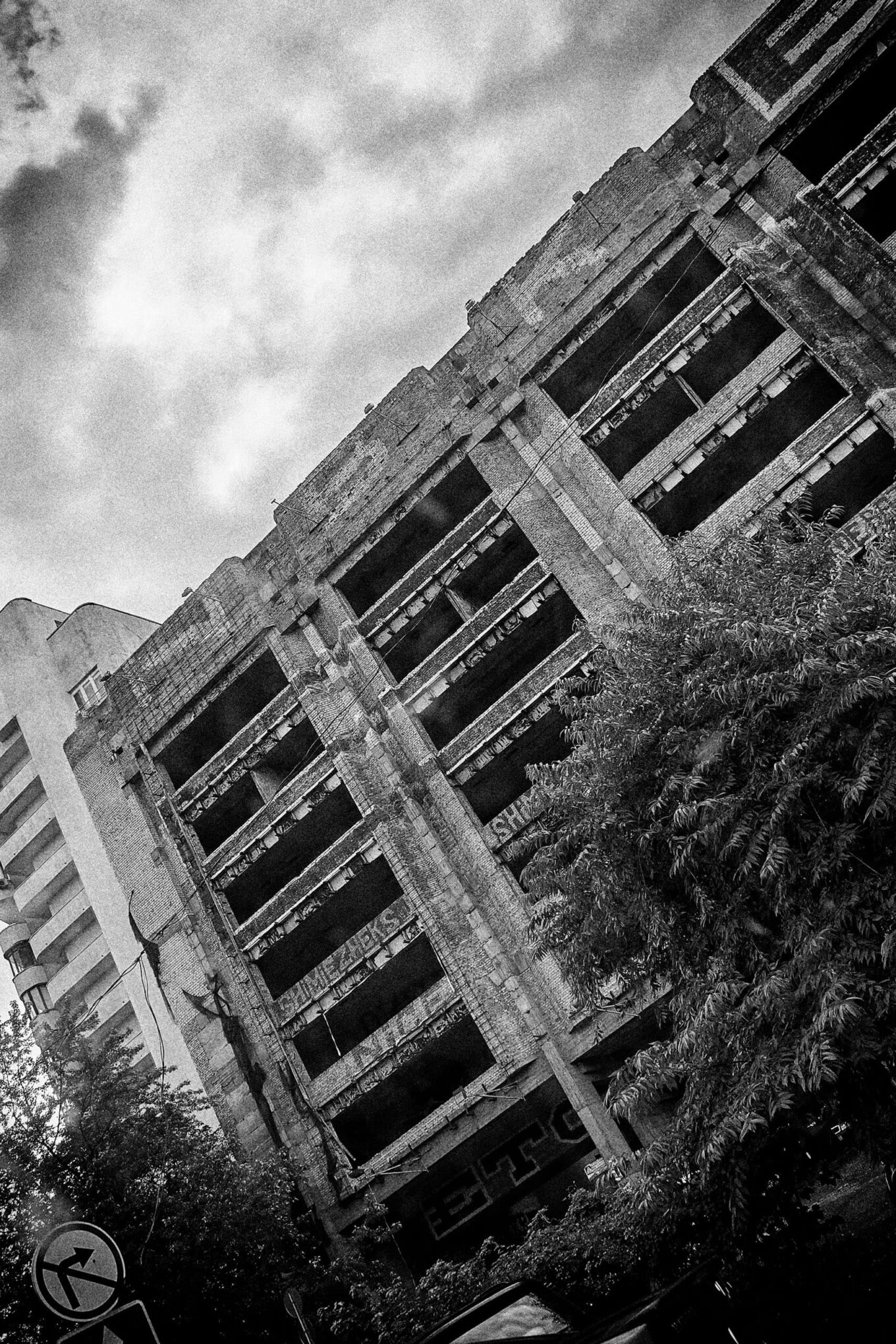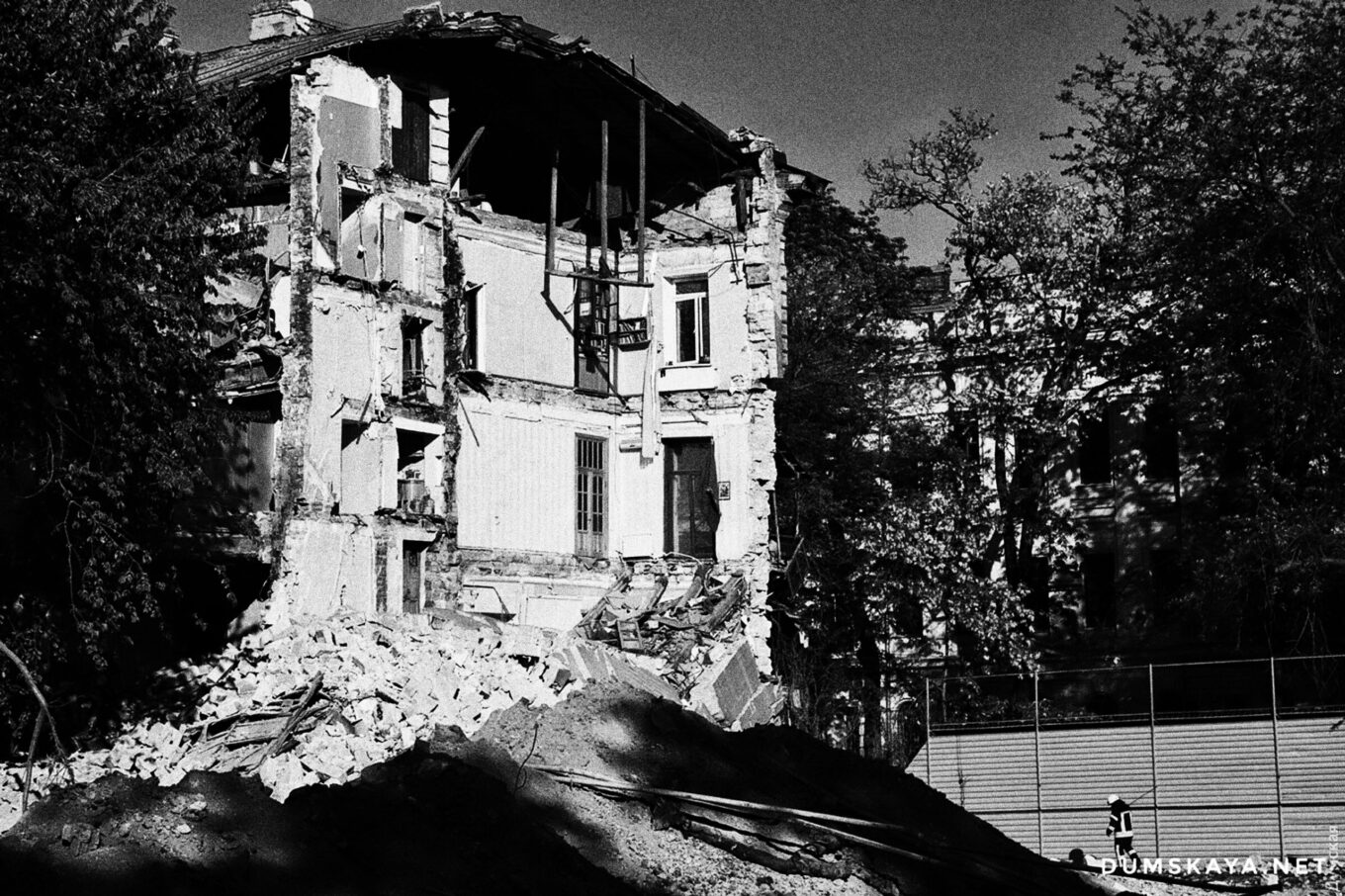 «Подвійний внутрішній двір будівлі був утворений після влучення авіаційного снаряда в частину житлового будинку під час Другої світової війни. Перекриття тоді не відновлювали, були прорізані додаткові фасадні вікна та розширені дверні отвори. Після 70 років експлуатації було виявлено спучування зі своєї площини внутрішньодворової стіни на 170 мм і розкриття тріщин на 50 мм.