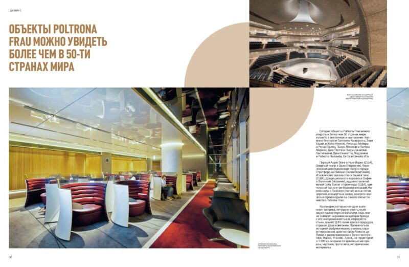 Первый Apple Store в Нью-Йорке (США), Оперный театр в Осло (Норвегия), Королевский шекспировский театр в городе Стратфорд-на-Эйвоне (Великобритания), Итальянское посольство в Вашингтоне (США), Дворец искусств королевы Софии в Валенсии (Испания), художественный музей Getty Center в Брентвуде (США), зрительный зал внутри башни инноваций Жокей-клуба в Гонконге (Китай) и еще сотни церквей, концертных залов, конгресс-холлов не производили бы такого впечатления без Poltrona Frau.