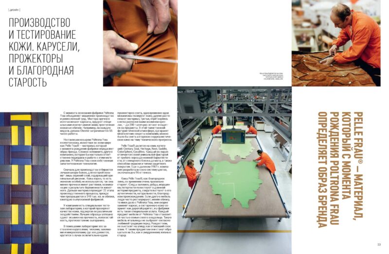 Но главным козырем Poltrona Frau является кожа, известная во всем мире как Pelle Frau® — материал, который с момента рождения фабрики определяет образ бренда. Сложно вспомнить другую компанию, которая бы настолько ответственно подходила к работе с этим материалом. У Poltrona Frau своя собственная запатентованная технология.