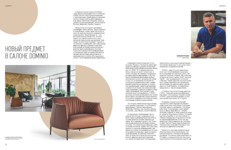 «Компания Dominio Group уже 15 лет на рынке Украины. Сначала мы фокусировались на импорте дверей и освещения. Мебельное направление появилось позже, где‑то в 2009 г. В то время рынок был очень сырым, не существовало как такового восприятия знаменитых брендов, истории и философии фабрик. А без глубокого понимания философии вообще невозможно сделать правильный выбор. К счастью, со временем все меняется, и сегодня на украинском рынке в сфере дизайна уникальные предметы, созданные дизайнерами с мировыми именами, становятся все более востребованными. Наша компания старается выбирать в партнерство фабрики, сочетающие в себе высокое качество и идейность. С 2010 г. мы очень активно развиваемся, постоянно инвестируя в расширение нашего бизнеса. Это и новые шоурумы, и постоянная смена экспозиции, и презентация новинок.