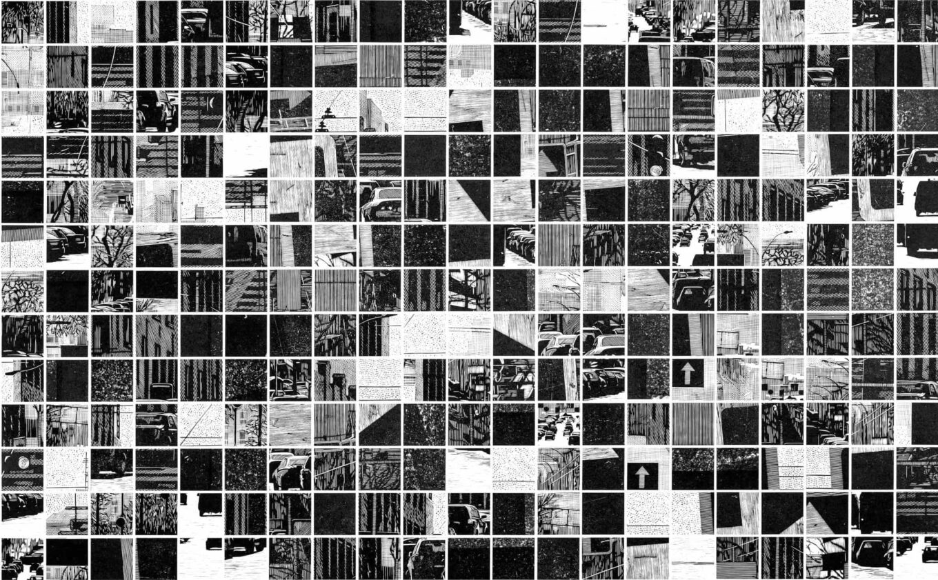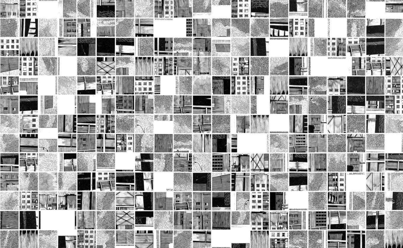 О. Д.: Больших станковых работ за год я могу сделать не так уж много — максимум три-четыре. Работа над одной формой занимает от двух до трех месяцев. Ты утомляешься, потому что проходит несколько месяцев — а результата все еще не можешь почувствовать. При этом, естественно, у меня остаются не очень хорошие оттиски, которые не удовлетворяют меня по качеству — по тону, по насыщенности краски. Насобиралось какое‑то количество условного брака. Как‑то было у меня настроение, я порезала и сложила их как пазл — сначала в маленьком формате. Мне стало интересно. Первые коллажи, которые я сделала, были более абстрактными. Это мозаика, сложенная из кусочков, в каждом из которых своя жизнь. Опознать какой‑то пейзаж там было невозможно. Прошло время — и опять накопилось какое‑то количество оттисков. Я решила, что можно попробовать сделать что‑то более узнаваемое. И действительно — за последние годы вокруг появилось много стеклянных поверхностей. Они, конечно, влияют на пейзаж, появляются какие‑то отражения, преломления. Я попробовала передать эту идею, ритмы, повторы — получилась новая серия.