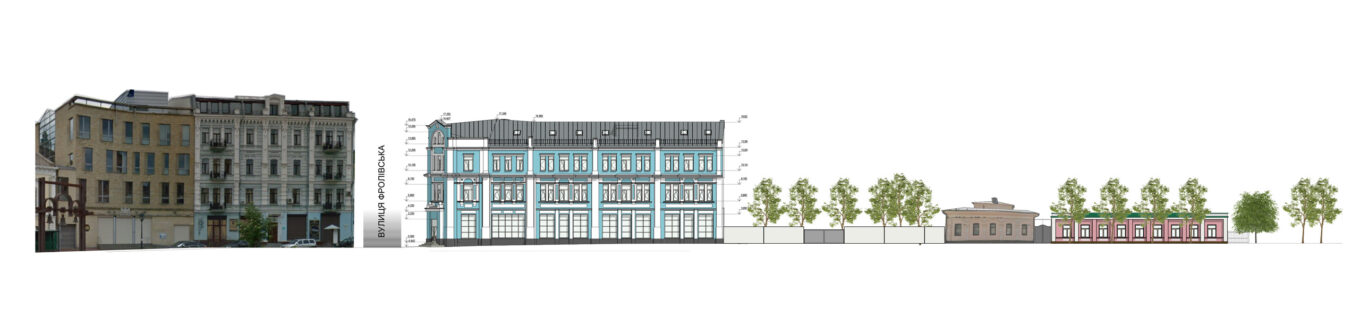 Ще один важливий аспект — захист цоколя. Замість фарбування ми передбачили облицювання гранітом. Це принципове рішення, зважаючи на складні гідрологічні умови: під час сильних дощів по Фролівській вулиці проходить значний потік води, і без надійного захисту цоколь швидко зволожувався б і руйнувався. Граніт у цьому випадку працює і як захисний, і як архітектурний елемент.