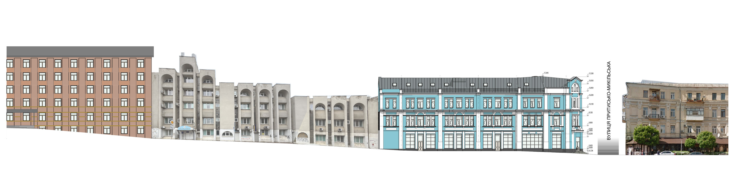 Ще один важливий аспект — захист цоколя. Замість фарбування ми передбачили облицювання гранітом. Це принципове рішення, зважаючи на складні гідрологічні умови: під час сильних дощів по Фролівській вулиці проходить значний потік води, і без надійного захисту цоколь швидко зволожувався б і руйнувався. Граніт у цьому випадку працює і як захисний, і як архітектурний елемент.