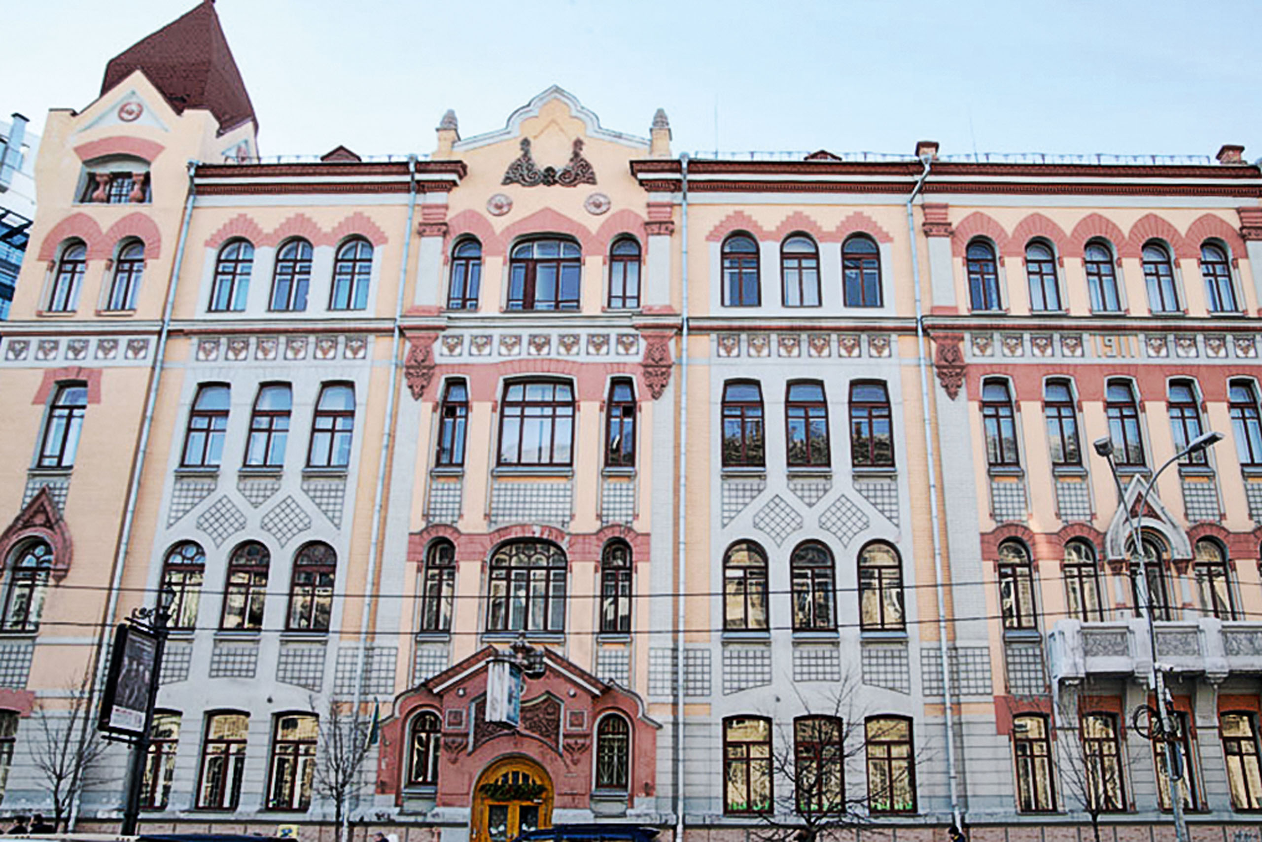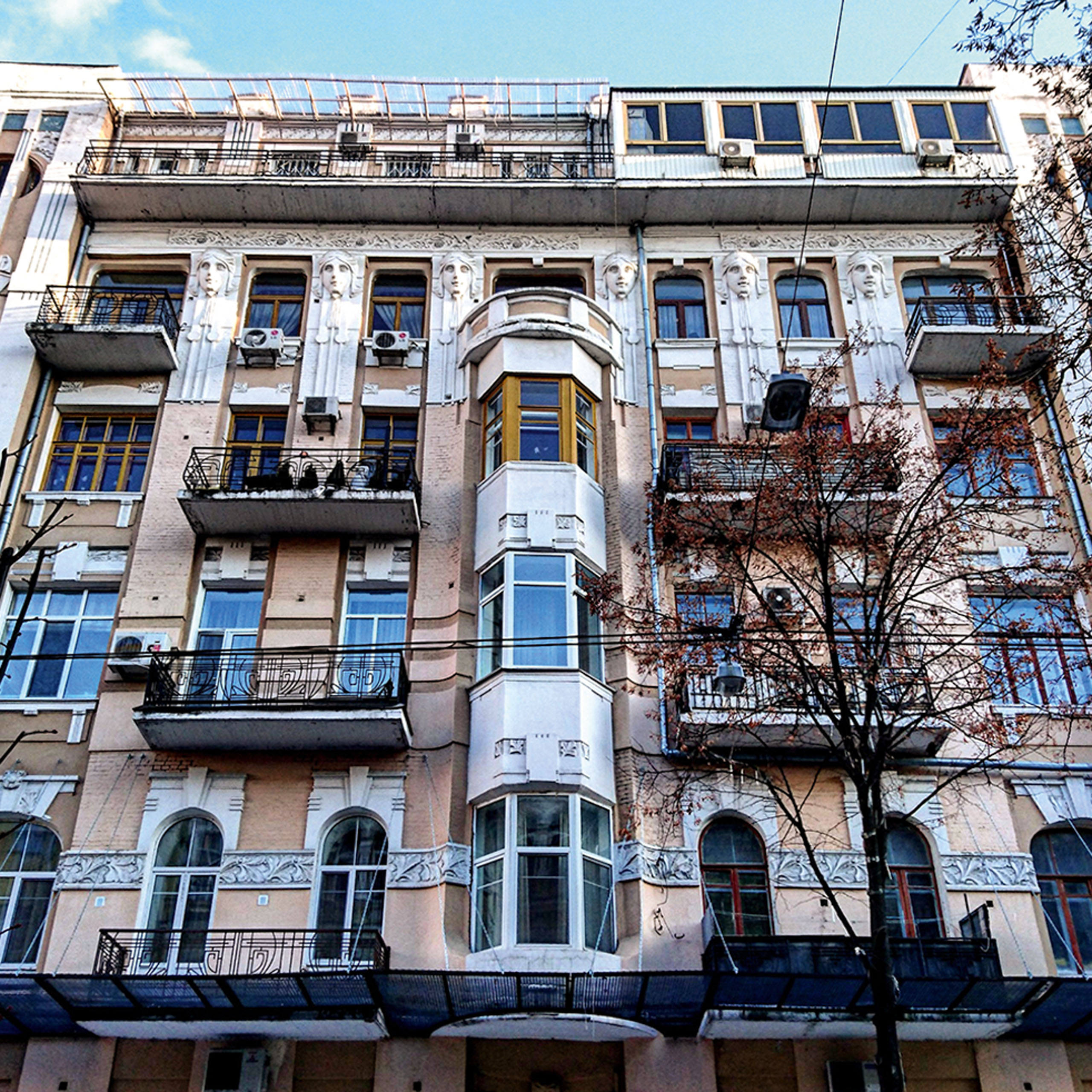 Доходный дом в стиле модерн, построенный в 1904 г., был спроектирован архитектором Александром Вербицким. В начале ХХ в. здание было одним из самых высоких в центре Киева. Примечательный элемент фасада — большие женские маскароны в простенках окон пятого этажа. Кроме того, интерес представляют кованые ограждения балконов. В 1906—1907 гг. на первом этаже дома в пятикомнатной квартире проживала Анна Ахматова, а также бывал Николай Гумилев, который в тот период ухаживал за поэтессой.