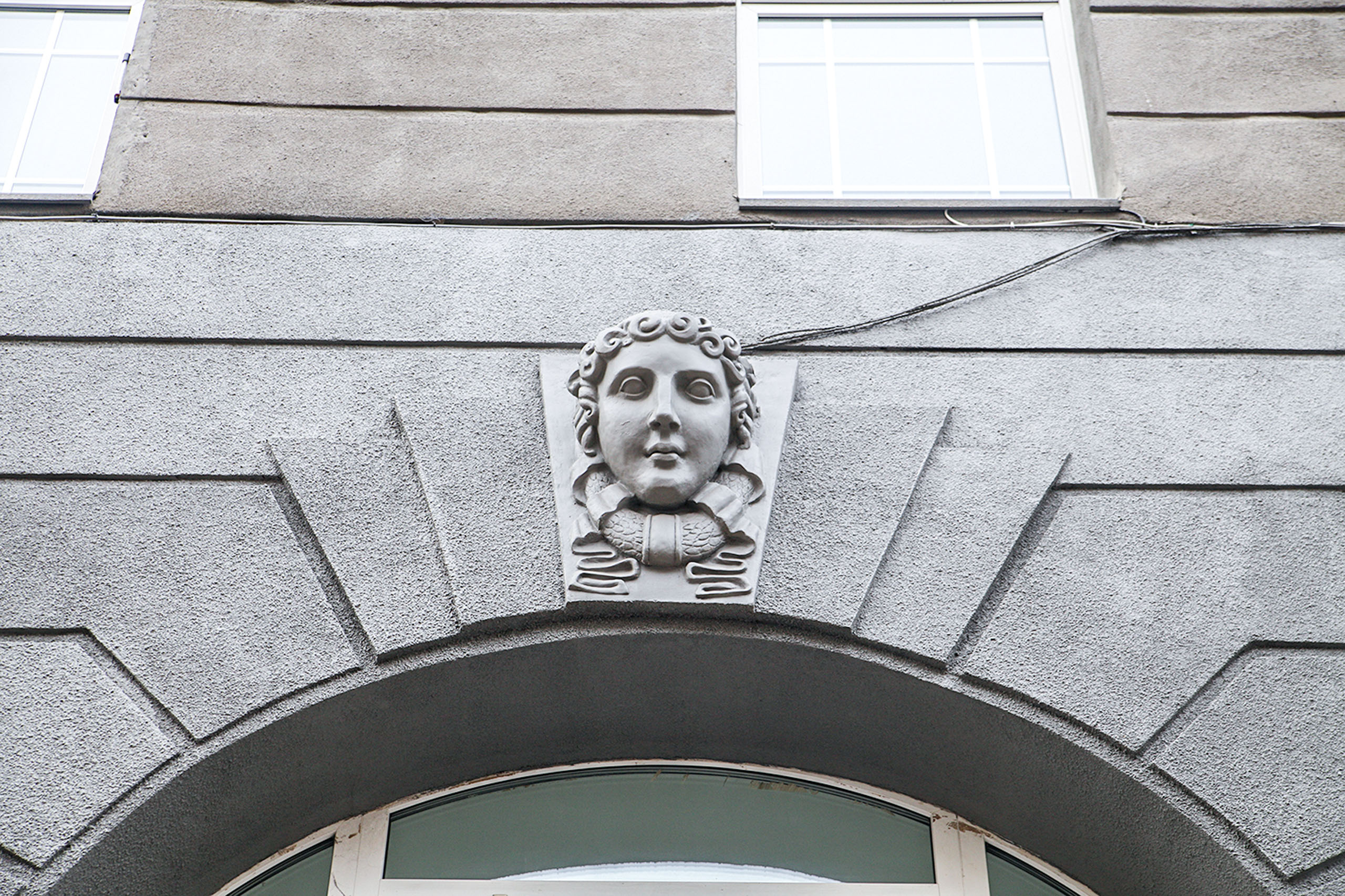 Маскароны — скульптурные украшения на фасадах зданий в форме головы человека или животного — довольно распространенный элемент декора в Киеве, они встречаются на зданиях разного стиля, в основном построенных в период с начала ХХ в. до Первой мировой войны. Любители насчитали почти тысячу уникальных «каменных масок» в столице. Несколько маскаронов украшают серый особняк в стиле неоклассицизма возле Пассажа в Киеве. Он был построен в 1914 г. как доходный дом страхового общества «Россия». Во время войны пострадал от огня, но со временем его отреставрировали. Известно, что там жил известный украинский оперный певец Иван Паторжинский, который исполнял партии Ивана Сусанина, Бориса Годунова и Тараса Бульбы в одноименных операх.