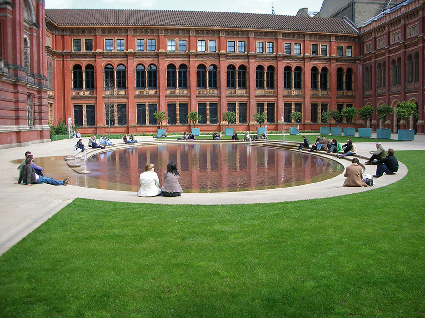 Сад перед Музеем Виктории и Альберта — тоже дело рук Кима Уилки. Простой эллипс центрального фонтана является фокальной точкой площади, которую окружают парковые газоны, аллеи с лимонными деревьями в кадках, оранжерея и само здание музея
