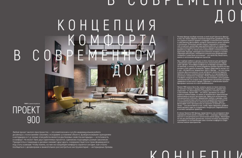В стенах Проекта 900 бренды представлены как инструмент формирования стиля жизни, а вместе с тем — культуры сбалансированного и концептуального наполнения жилой среды. Некоторые из них мы рассмотрим детальнее, попутно пытаясь исследовать и разобрать на составляющие само понятие комфорта в современном жилом пространстве.