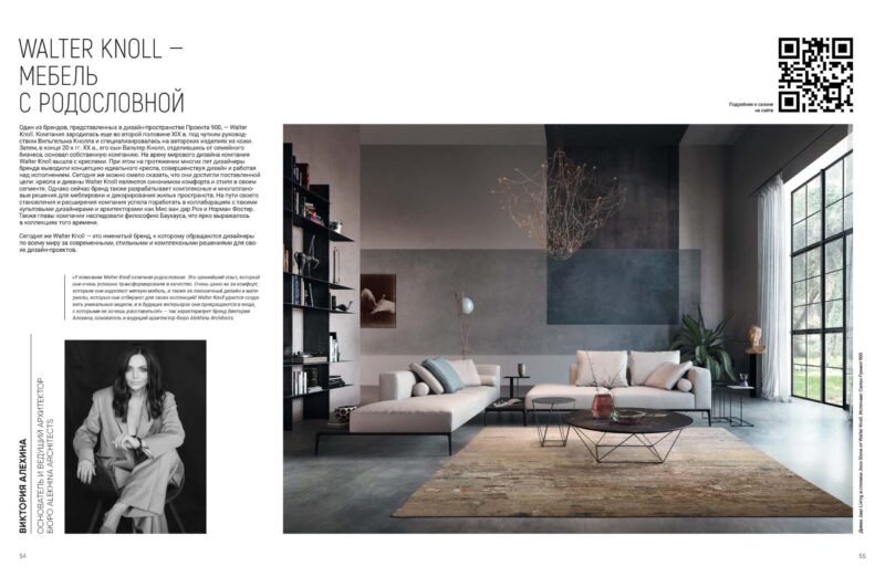 «У компании Walter Knoll отличная родословная. Это ценнейший опыт, который они очень успешно трансформировали в качество. Очень ценю их за комфорт, которым они наделяют мягкую мебель, а также за лаконичный дизайн и материалы, которые они отбирают для своих коллекций! Walter Knoll удается создавать уникальные модели, и в будущих интерьерах они превращаются в вещи, с которыми не хочешь расставаться!» — так характеризует бренд Виктория Алехина, основатель и ведущий архитектор бюро Alekhina Architects.