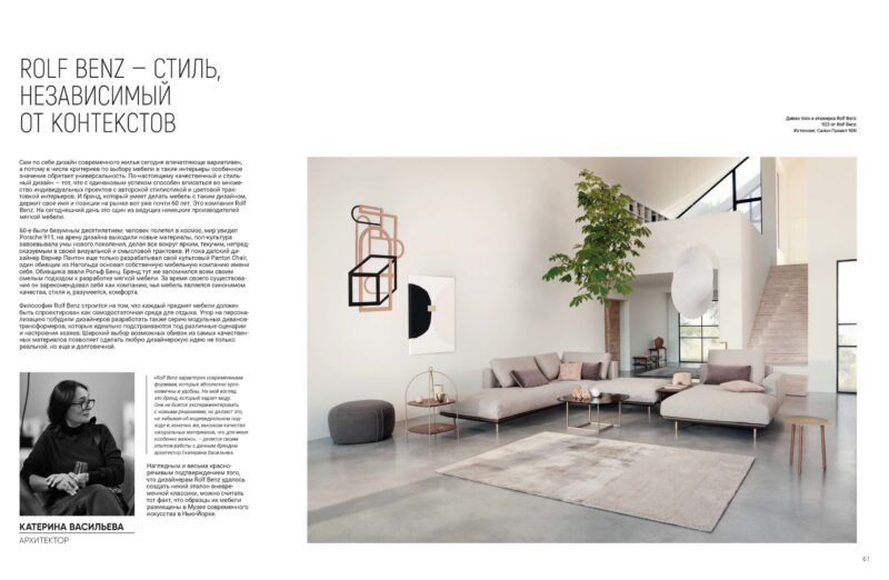 «Rolf Benz характерен современными формами, которые абсолютно эргономичны и удобны. На мой взгляд, это бренд, который задает моду. Они не боятся экспериментировать с новыми решениями, но делают это, не забывая об индивидуальном подходе и, конечно же, высоком качестве натуральных материалов, что для меня особенно важно», — делится своим опытом работы с данным брендом архитектор Екатерина Васильева.