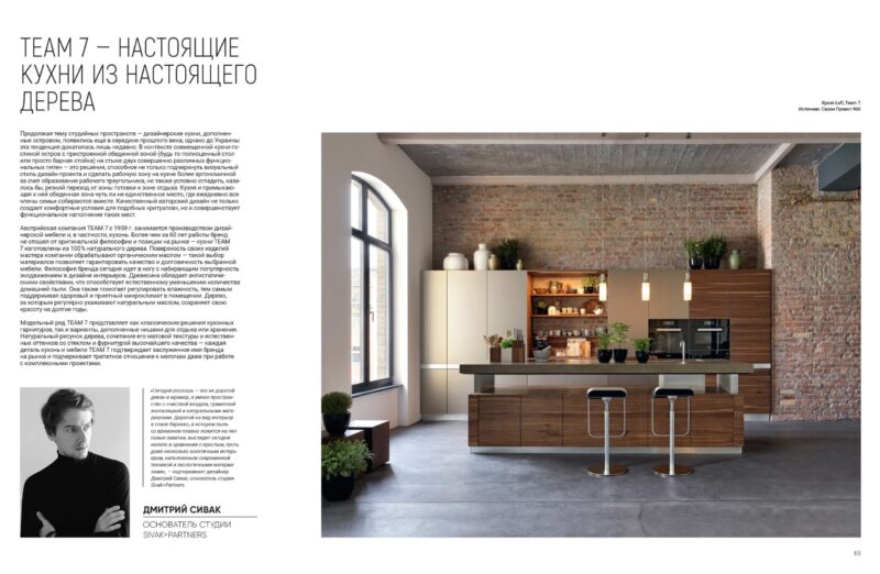 Австрийская компания TEAM 7 с 1959 г. занимается производством дизайнерской мебели и, в частности, кухонь. Более чем за 60 лет работы бренд не отошел от оригинальной философии и позиции на рынке — кухни TEAM 7 изготовлены из 100 % натурального дерева. Поверхность своих изделий мастера компании обрабатывают органическим маслом — такой выбор материалов позволяет гарантировать качество и долговечность выбранной мебели. Философия бренда сегодня идет в ногу с набирающим популярность экодвижением в дизайне интерьеров. Древесина обладает антистатическими свойствами, что способствует естественному уменьшению количества домашней пыли. Она также помогает регулировать влажность, тем самым поддерживая здоровый и приятный микроклимат в помещении. Дерево, за которым регулярно ухаживают натуральным маслом, сохраняет свою красоту на долгие годы.