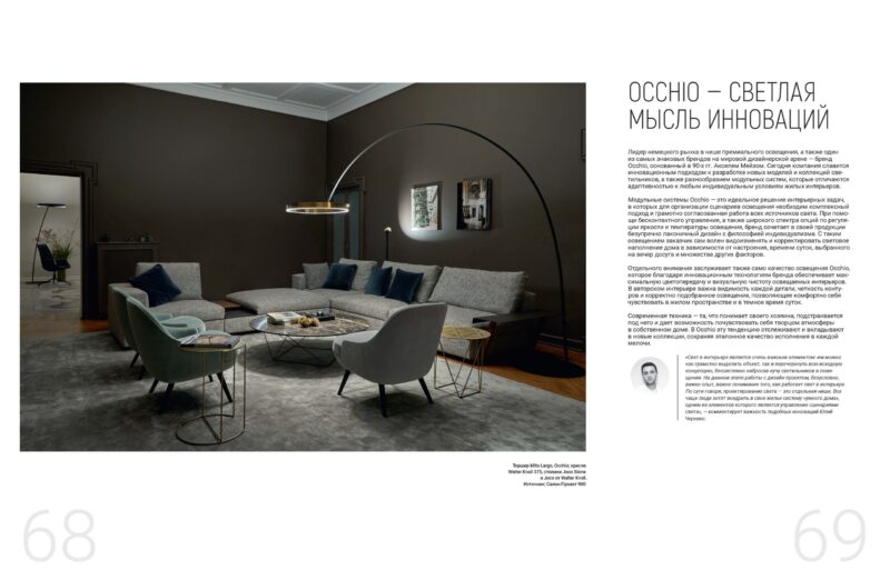 Лидер немецкого рынка в нише премиального освещения, а также один из самых знаковых брендов на мировой дизайнерской арене — бренд Occhio, основанный в 90‑х гг. Акселем Мейзом. Сегодня компания славится инновационным подходом к разработке новых моделей и коллекций светильников, а также разнообразием модульных систем, которые отличаются адаптивностью к любым индивидуальным условиям жилых интерьеров.