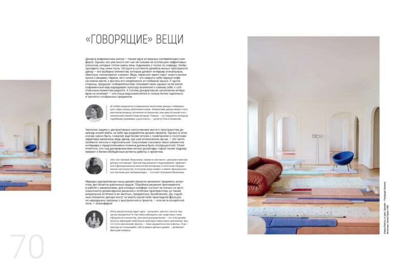 «Роль декора всегда будет одна — вызывать чувство счастья там, где вы находитесь! Я счастлива наблюдать, как люди чаще стали обращаться к искусству. Для меня декорирование — это этап дизайн-проекта, имеющий наибольшее культурно-смысловое наполнение. Все, что этого наполнения лишено, — лишь украшательство и фальш. И да — никогда не отказывайте себе в живых цветах в доме!» — добавляет Виктория Алехина.