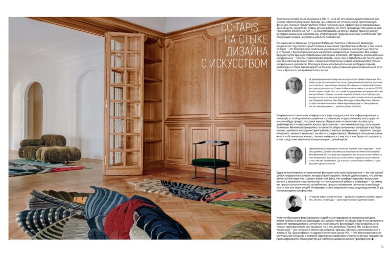 «В декорировании интерьера мы всегда охотно приветствуем арт. Особенно когда этот арт имеет не только декоративный характер, но также несет какую‑то смысловую нагрузку. Все меньше стараемся использовать декор ради декора. Очень любим использовать в проектах SVOYA studio ковры cc-tapis. Это тот случай, когда предмет интерьера работает как арт-объект. Считаю, что качественный скачок у этого бренда произошел после того, как они привлекли к работе таких гигантов дизайна, как Патрисия Уркиола, Жан-Мари Массад и Сабин Марселис. Именно cc-tapis повлиял на слом в самом видении продукта. Они доказали, что нет никаких рамок», — делится Денис Соколов.