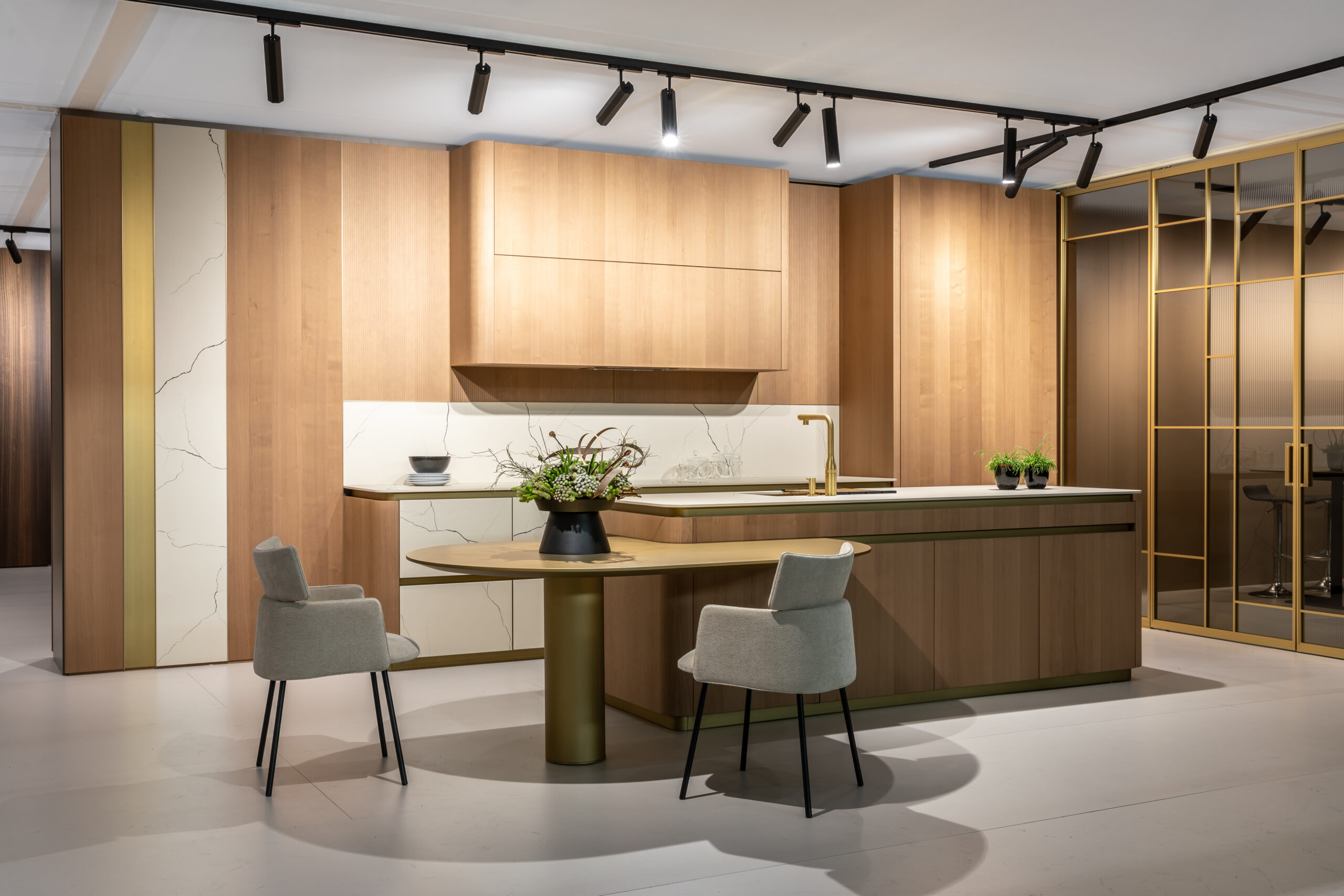 Концептуальна кухня RADIAL із м’якими заокругленнями кутів передає відчуття елегантності плавних ліній, створюючи довершене поєднання витонченого мінімалізму із сучасною функціональністю. Стенд ELIO HOME на KIFF-2025. Фото: © Sergiy Kadulin