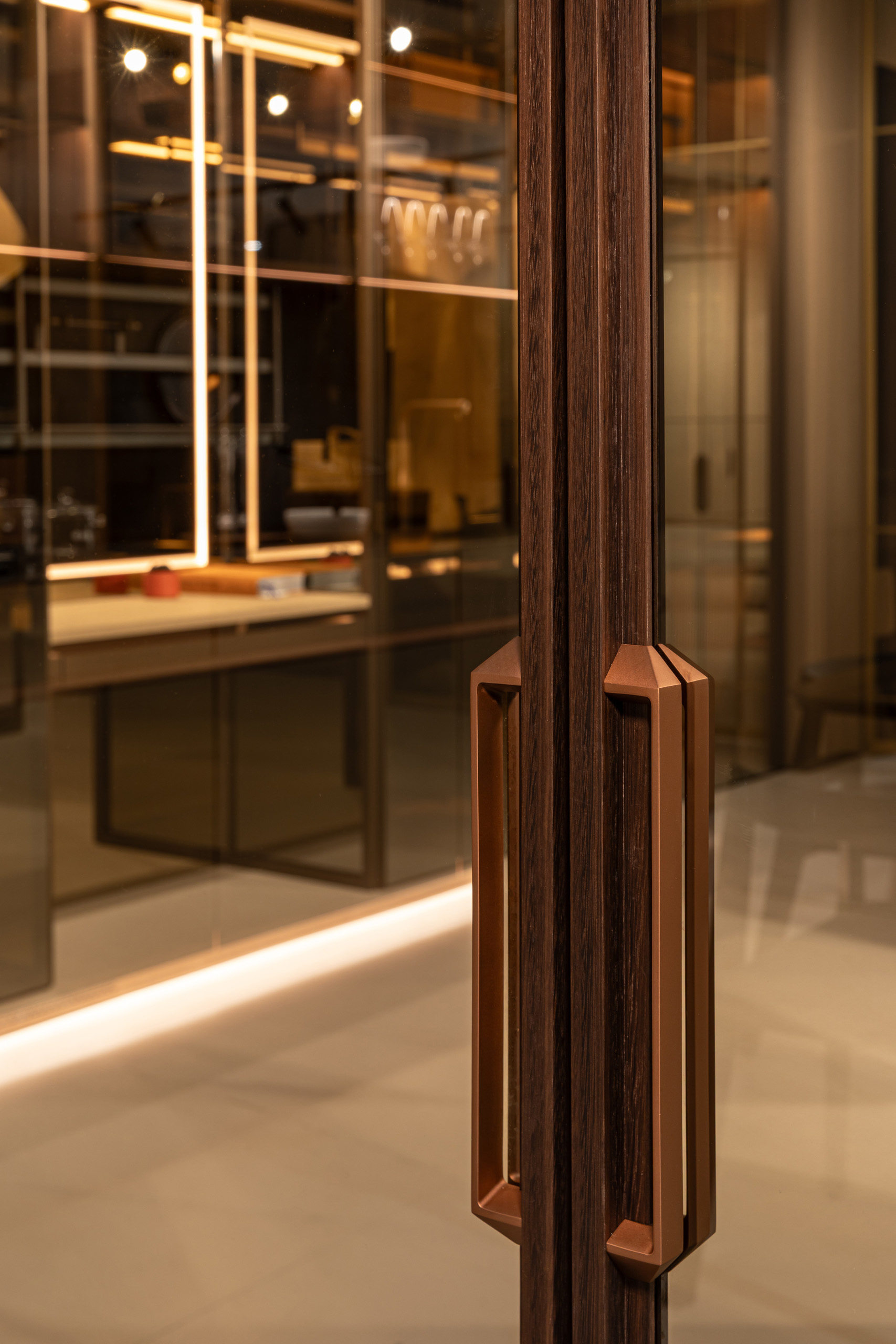 Досконала композиція вишуканої металевої фурнітури й тонкого профілю з текстурою дерева. Стенд ELIO HOME на KIFF-2025. Фото: © Sergiy Kadulin