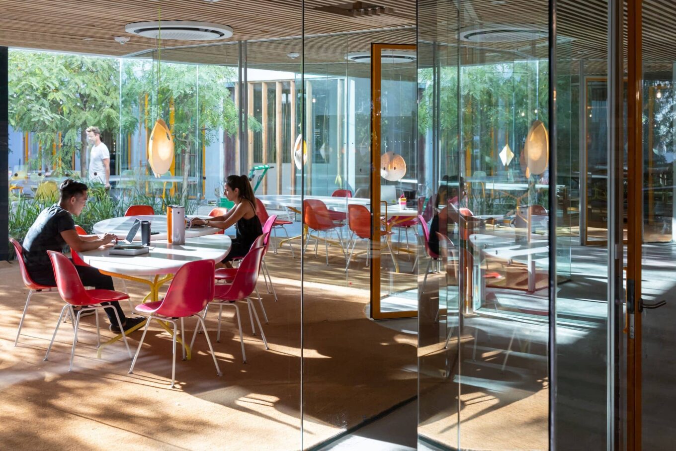 Офисы соединены между собой дорожками с деревянным настилом, чтобы стимулировать взаимодействие между различными арендаторами. На территории кампуса высадили около 6,5 тыс. растений (это самая плотная новая посадка в Калифорнии). Ландшафтные архитекторы выбрали такие виды, которые подходят для засушливого климата Лос-Анджелеса. При необходимости зеленые насаждения будут поливаться технологией «умного контроллера».
