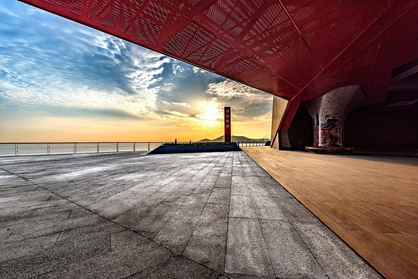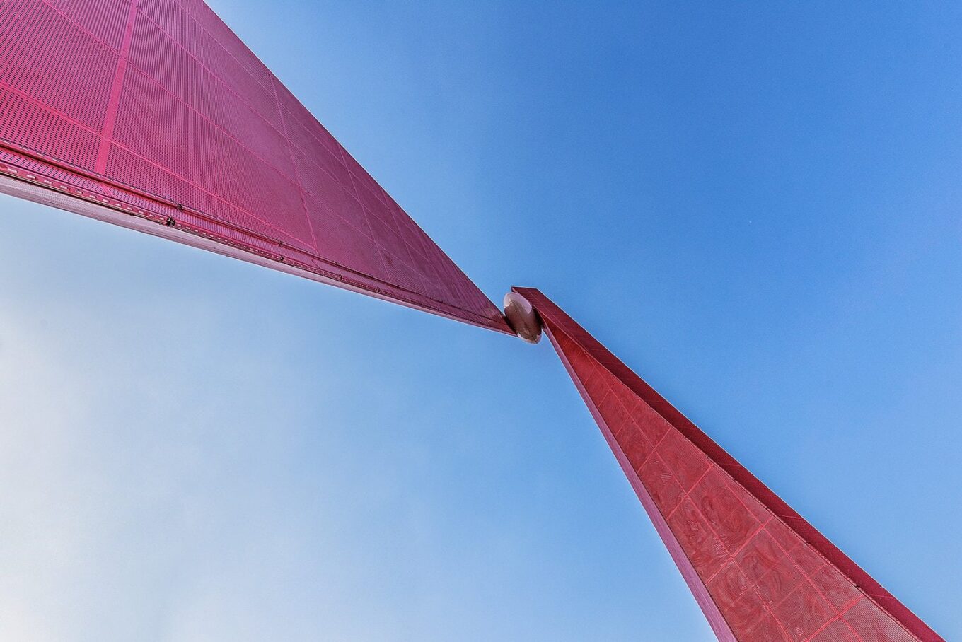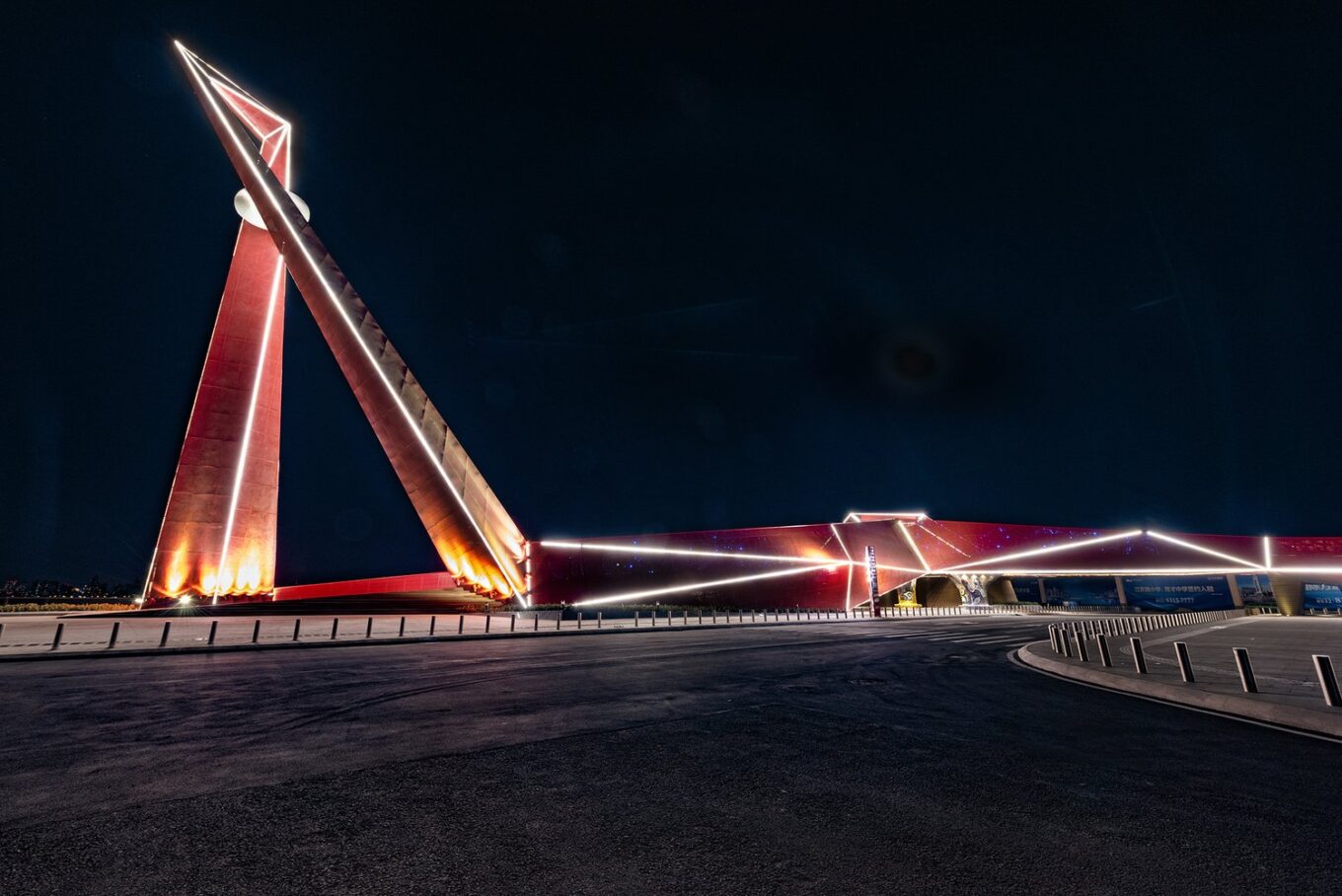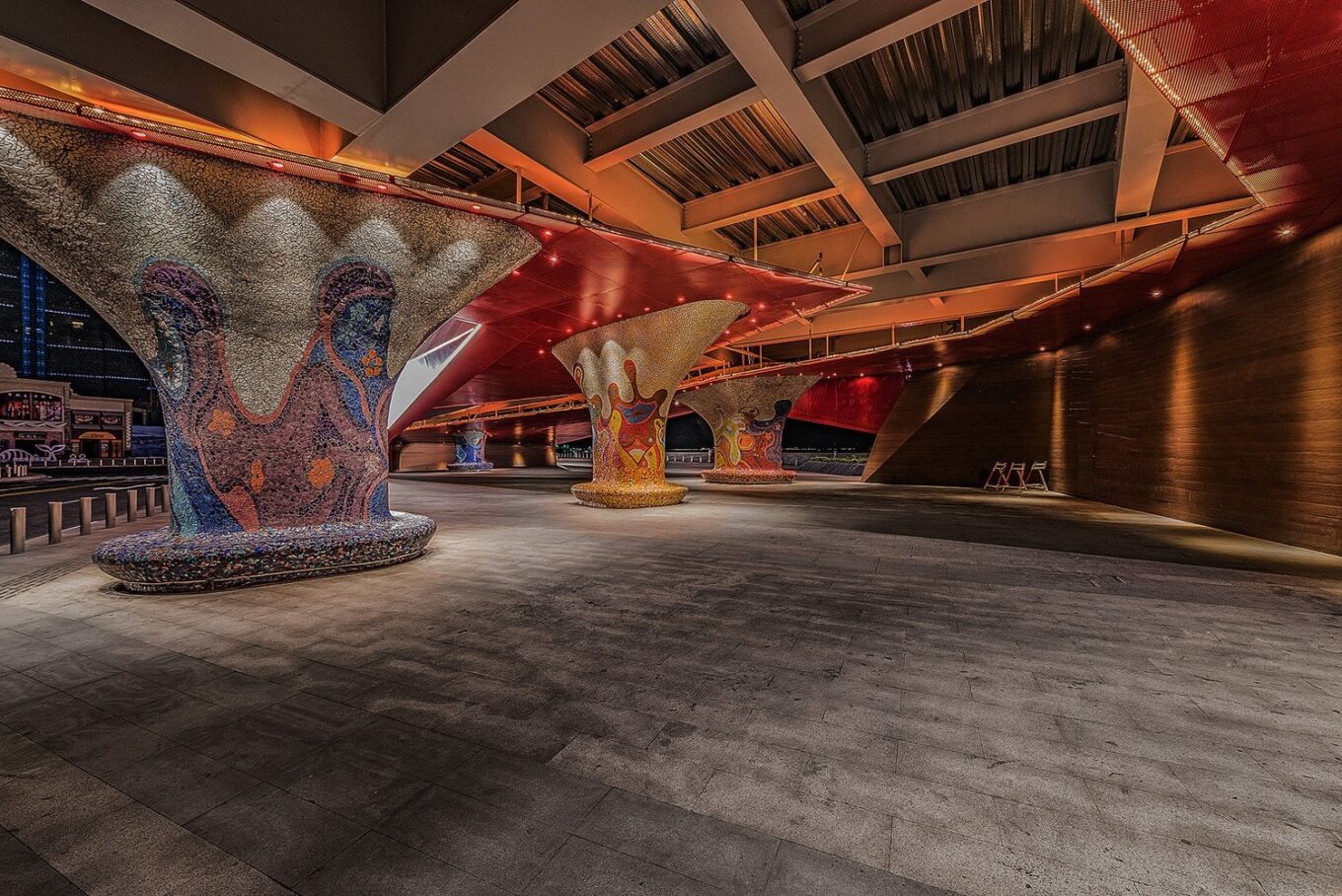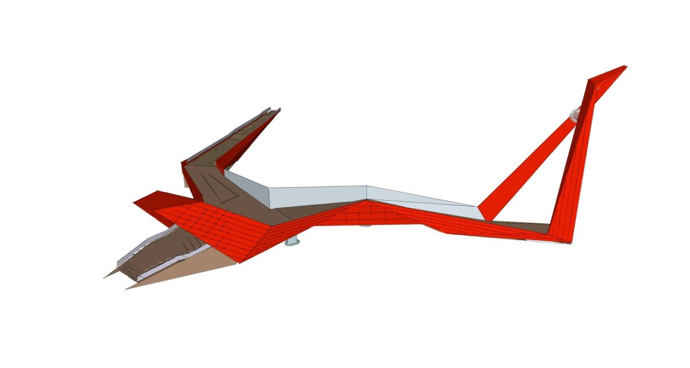 Динамику ломаных алых линий несколько смягчает деревянное палубное мощение, а массивные колонны «приземляют» стремительную конструкцию, удерживая птицу Феникс от взлета в неба.