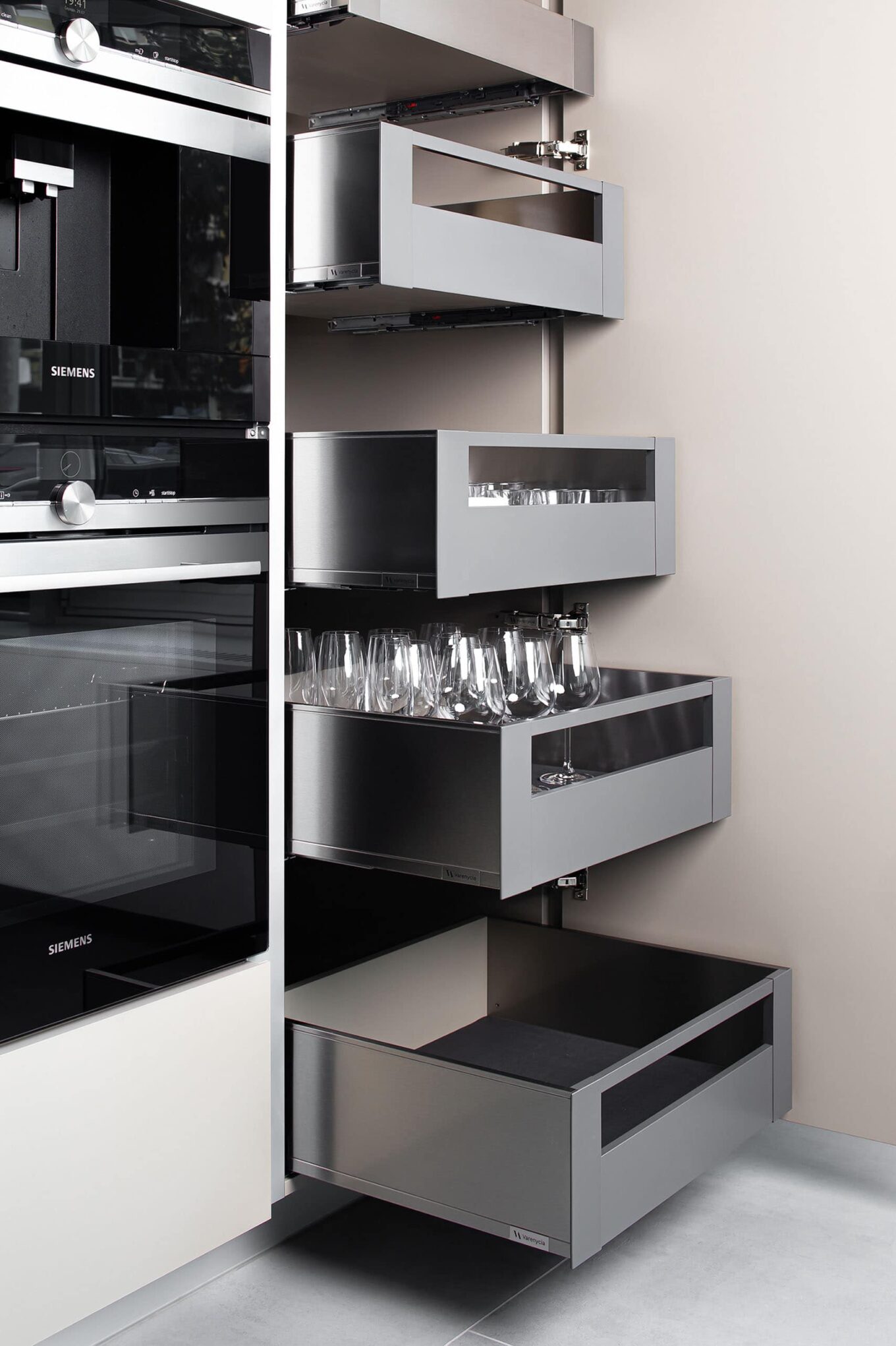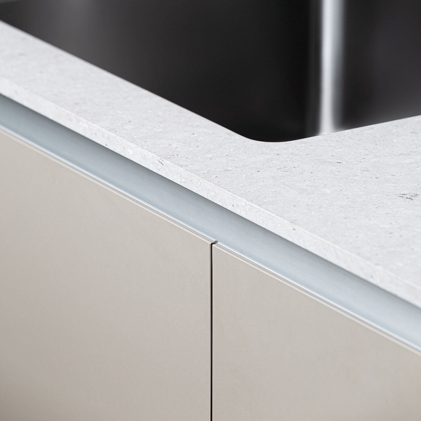 «Для каркаса нашої кухні ми обрали ламіновану ДСП бельгійської компанії Unilin, — розповідає Андрій. — Вона максимально відповідає нашим критеріям, а основний з них — товщина. Це важливий фактор, бо похибка навіть на міліметр впливає на загальний розмір корпусів. Крім того, всі крайки деталей проклеюються pure-клеєм, що значно підвищує показник вологостійкості та стійкість до перепаду температур». На практиці це означає, що їх можна використовувати в агресивному середовищі: не зважаючи на дію води, гарячої пари та наслідки інших процесів, що мають місце на кухні, її геометрія, форма деталей залишається незмінною.