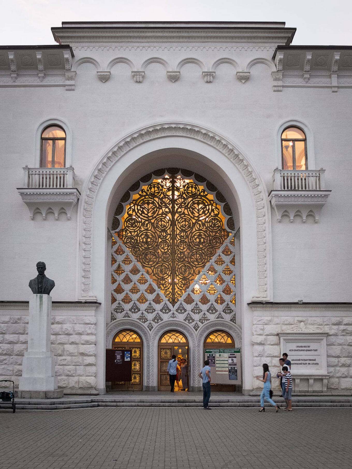 Сьогоднішній розкішний образ Абхазького драматичного театру з фонтанами-грифонами — це осучаснена репліка театру Алоїзі, що згорів у 1942 році. Будівлю було відновлено за десять років.