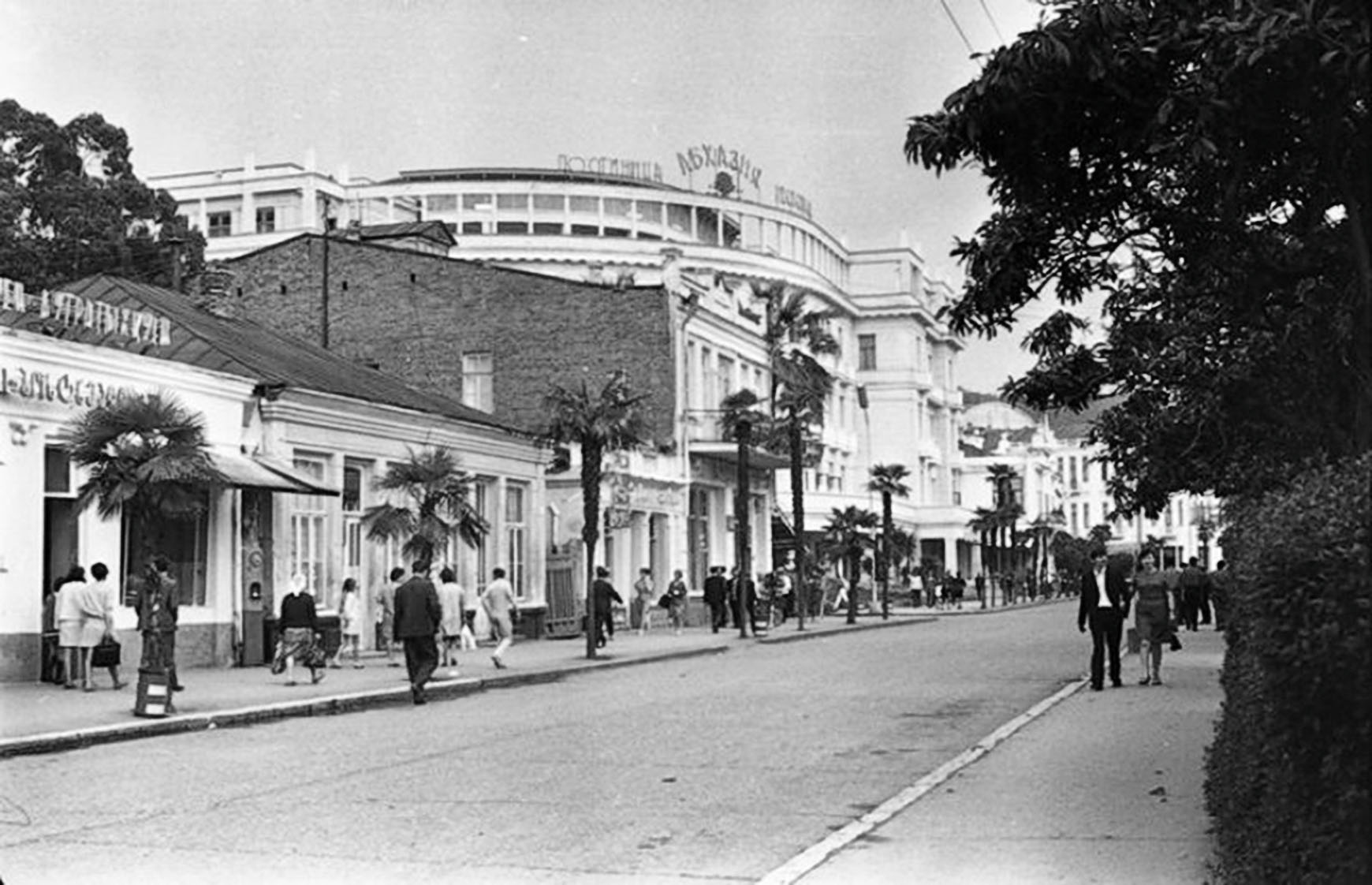 Праве та ліве крило будівлі Радміну Абхазької АРСР, побудованої за проєктом архітектора А. Щуко в 1935–1937 роках, являють собою архітектурну цінність як зразки сталінського ампіру. Дисгармонуючий із ландшафтом і навколишньою забудовою центральний корпус було зведено в 1985 році.