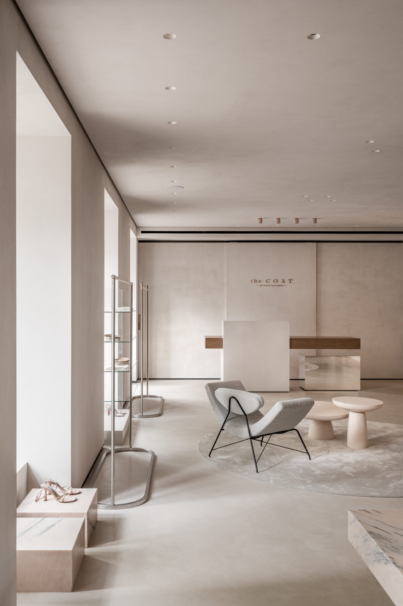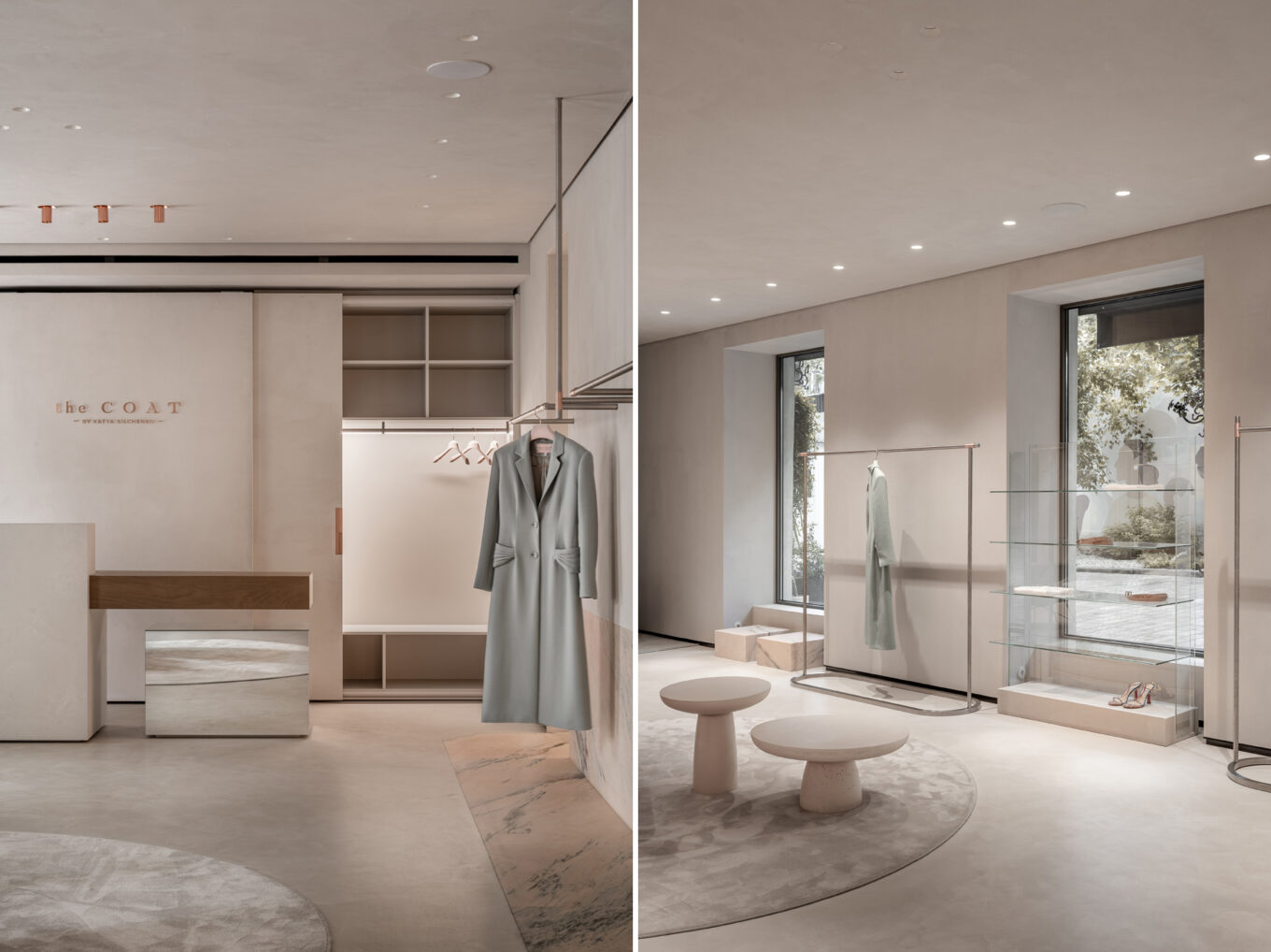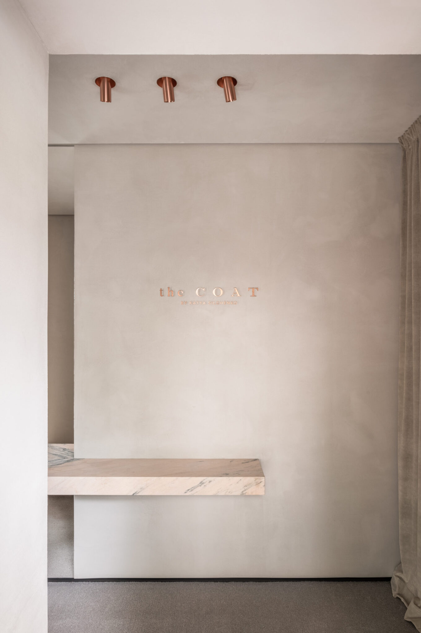 Одне зі значень слова «coat» англійською — «шар, покриття». Після тонування стелі, стін і підлоги в нейтрально-сірий із пісочним підтоном колір, підібраний вручну, приміщення трансформувалося в єдиний безшовний простір. Елегантне завершене тло не відволікає око та допомагає тримати фокус на головних об’єктах — колекції одягу і аксесуарів, створює гармонійні умови для перебування у просторі тривалий час і теплого спілкування з відвідувачами.