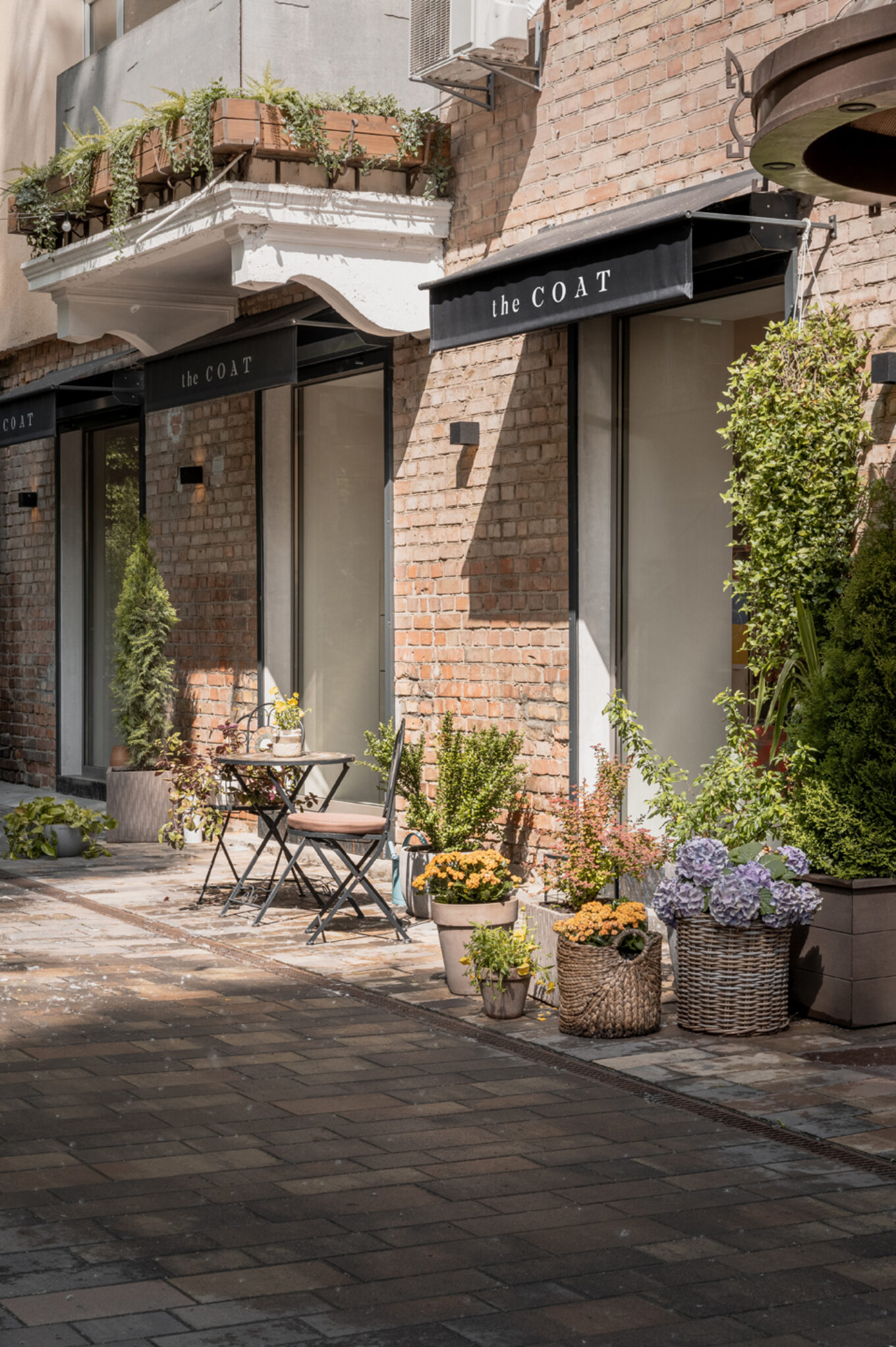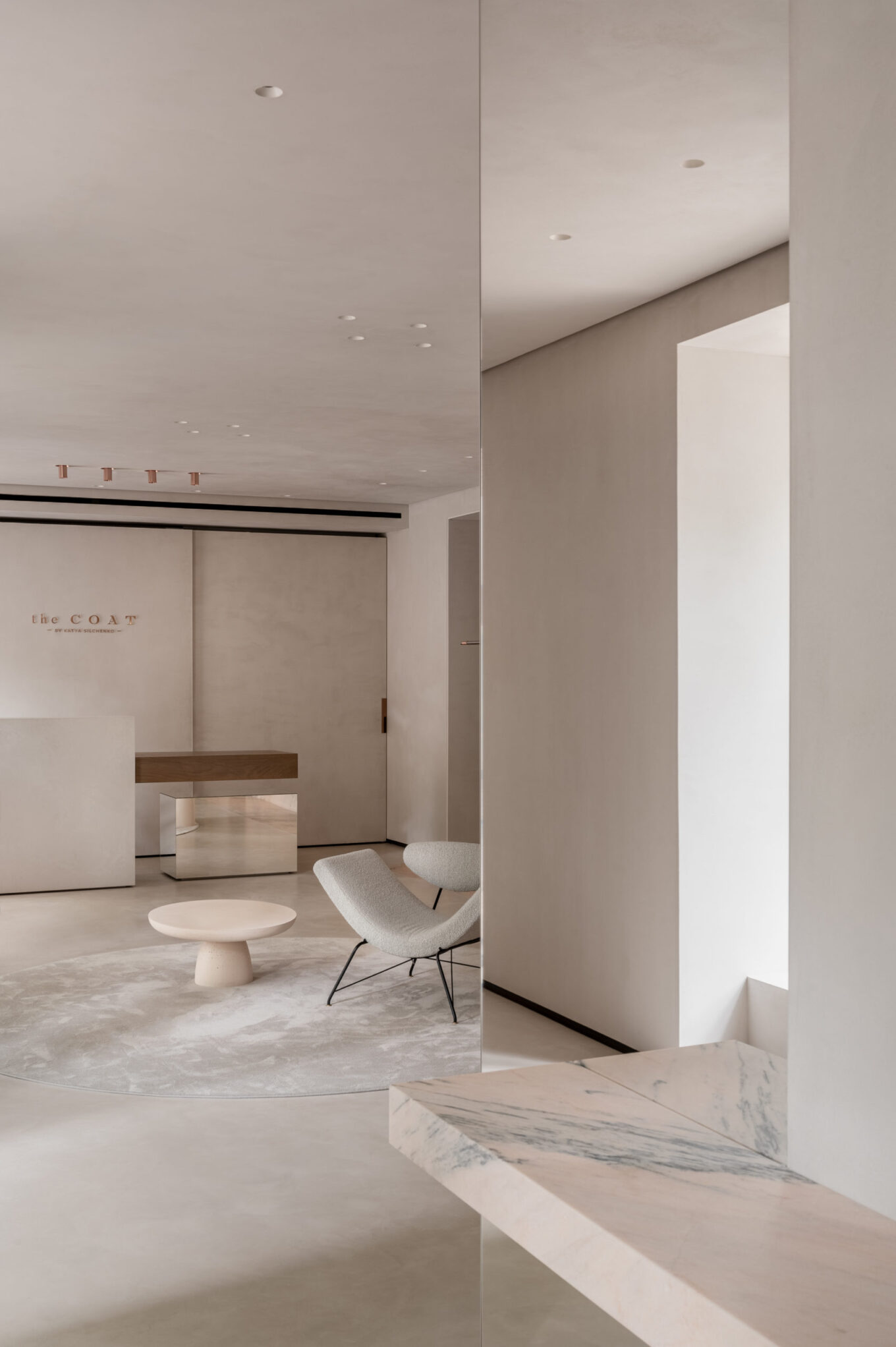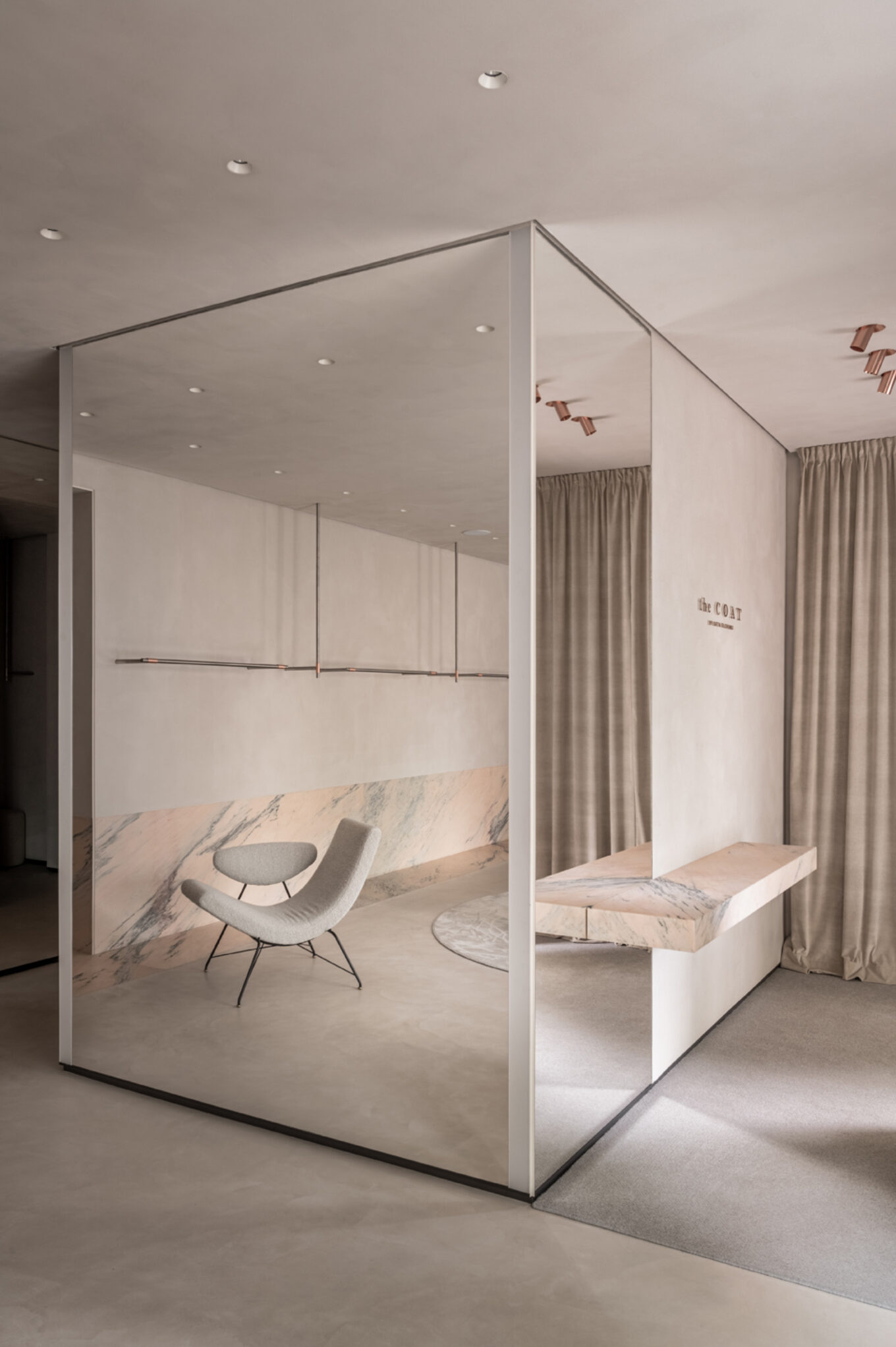 Одне зі значень слова «coat» англійською — «шар, покриття». Після тонування стелі, стін і підлоги в нейтрально-сірий із пісочним підтоном колір, підібраний вручну, приміщення трансформувалося в єдиний безшовний простір. Елегантне завершене тло не відволікає око та допомагає тримати фокус на головних об’єктах — колекції одягу і аксесуарів, створює гармонійні умови для перебування у просторі тривалий час і теплого спілкування з відвідувачами.