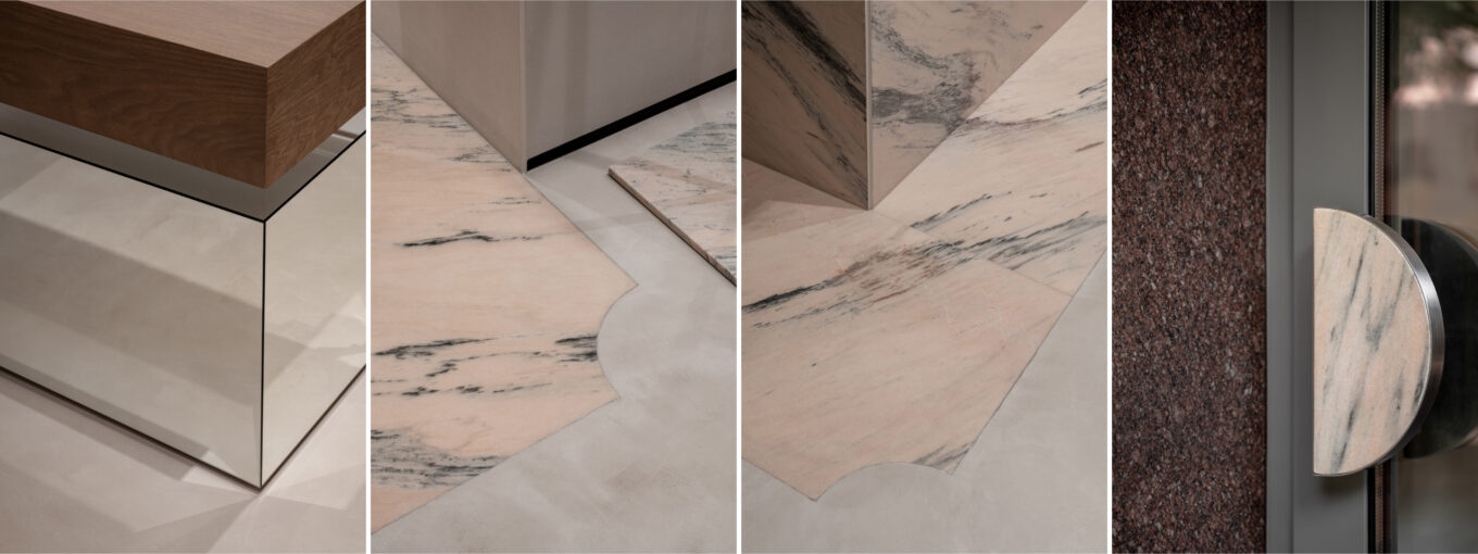 Ще одним об’єднуючим і акцентним прийомом стало використання елементів із мармуру відтінку Rosa Aurora. Кам’яні панелі з ніжно-бежевою базою та молочними, рожевими, сірими і ненасичено-теракотовими жилками інтегровані в стіни та підлогу, із цього самого матеріалу виконані й куби-тумби для взуття та основи вішаків.