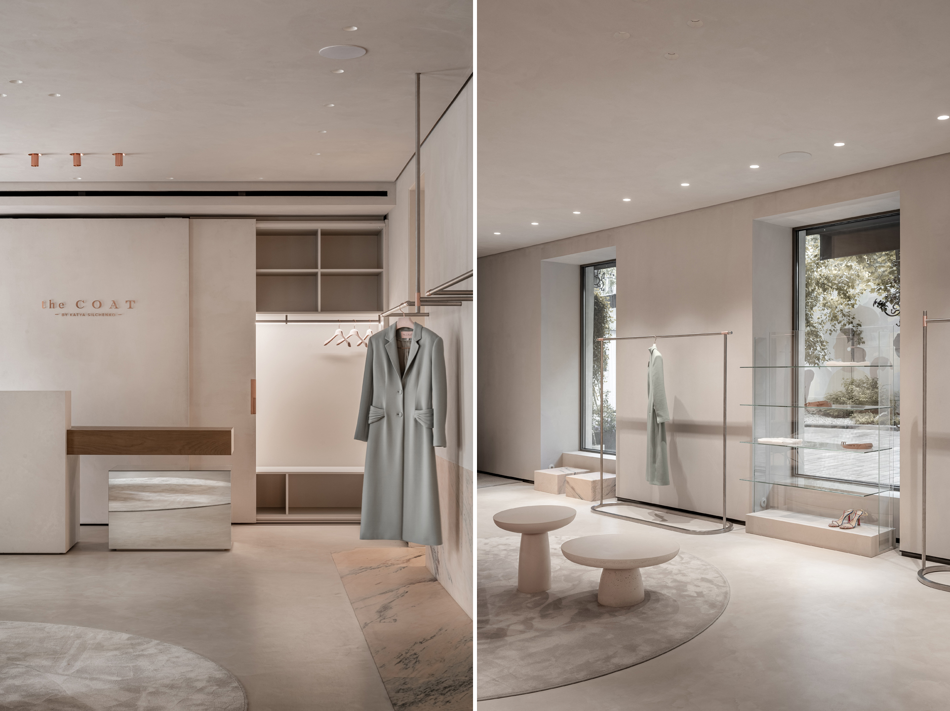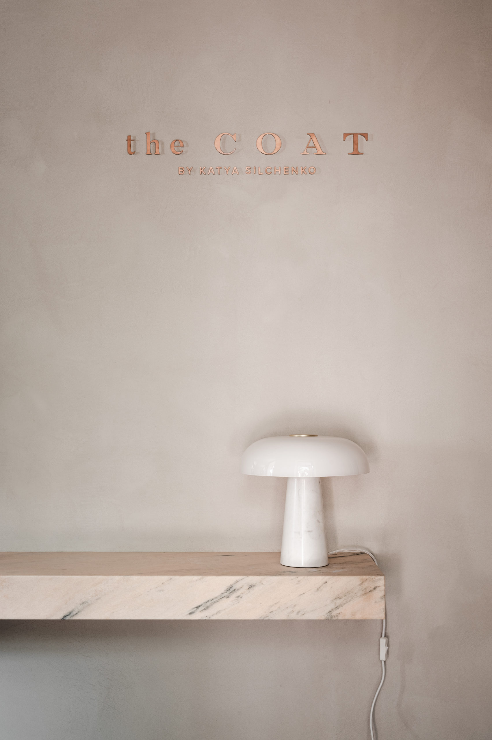 Одне зі значень слова «coat» англійською — «шар, покриття». Після тонування стелі, стін і підлоги в нейтрально-сірий із пісочним підтоном колір, підібраний вручну, приміщення трансформувалося в єдиний безшовний простір. Елегантне завершене тло не відволікає око та допомагає тримати фокус на головних об’єктах — колекції одягу і аксесуарів, створює гармонійні умови для перебування у просторі тривалий час і теплого спілкування з відвідувачами.