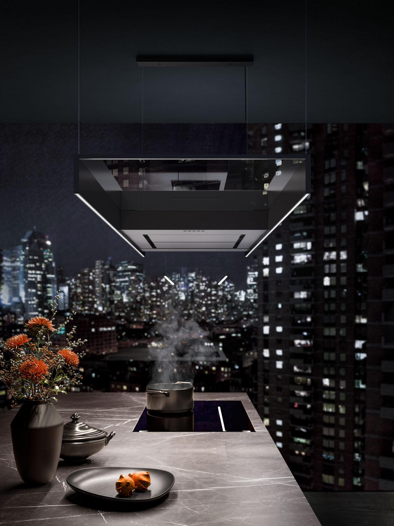 Не требуя громоздкого воздуховода, вытяжка Light представляет собой минималистичную пластину, подвешенную на тонких тросах. Объект выполнен из черных матовых алюминиевых профилей и стекла графитового оттенка. Строгую геометрию подчеркивает линия встроенного света. Вытяжка доступна в двух вариантах длины: 120 и 180 см.
