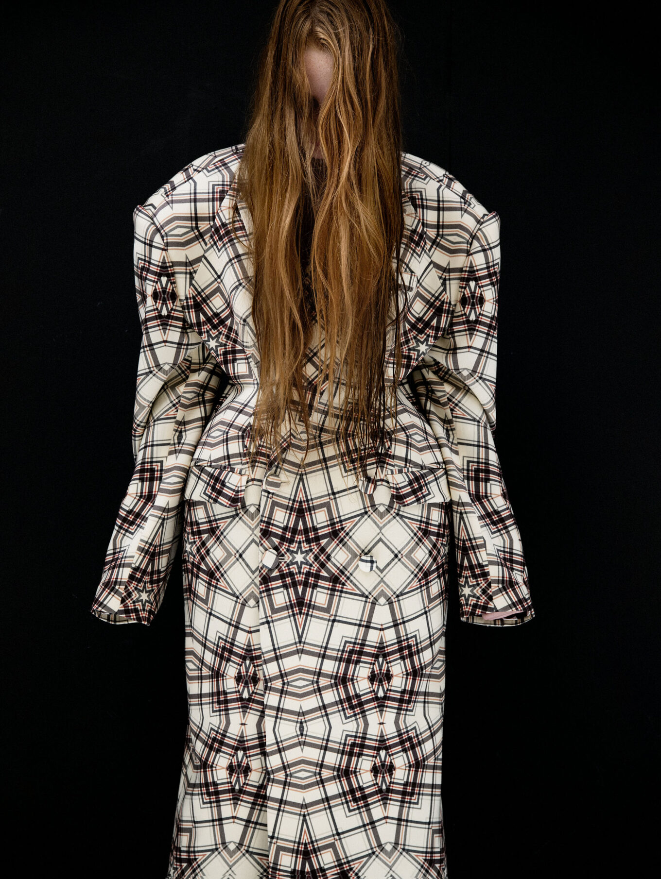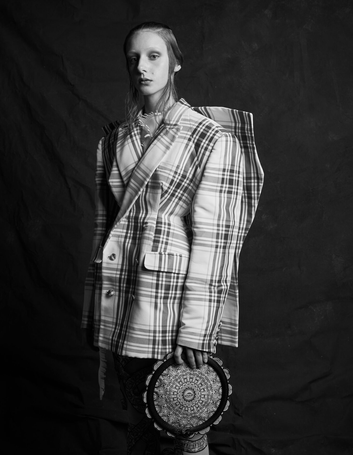 Піджак у шотландську клітинку кремового кольору з ефектом глянцю, круглий вишитий клатч уроборос, стиль Ferdi Sibbel, магістерська колекція Лізи Волосовської в Антверпенській академії. Фото: Ruben de Wilde