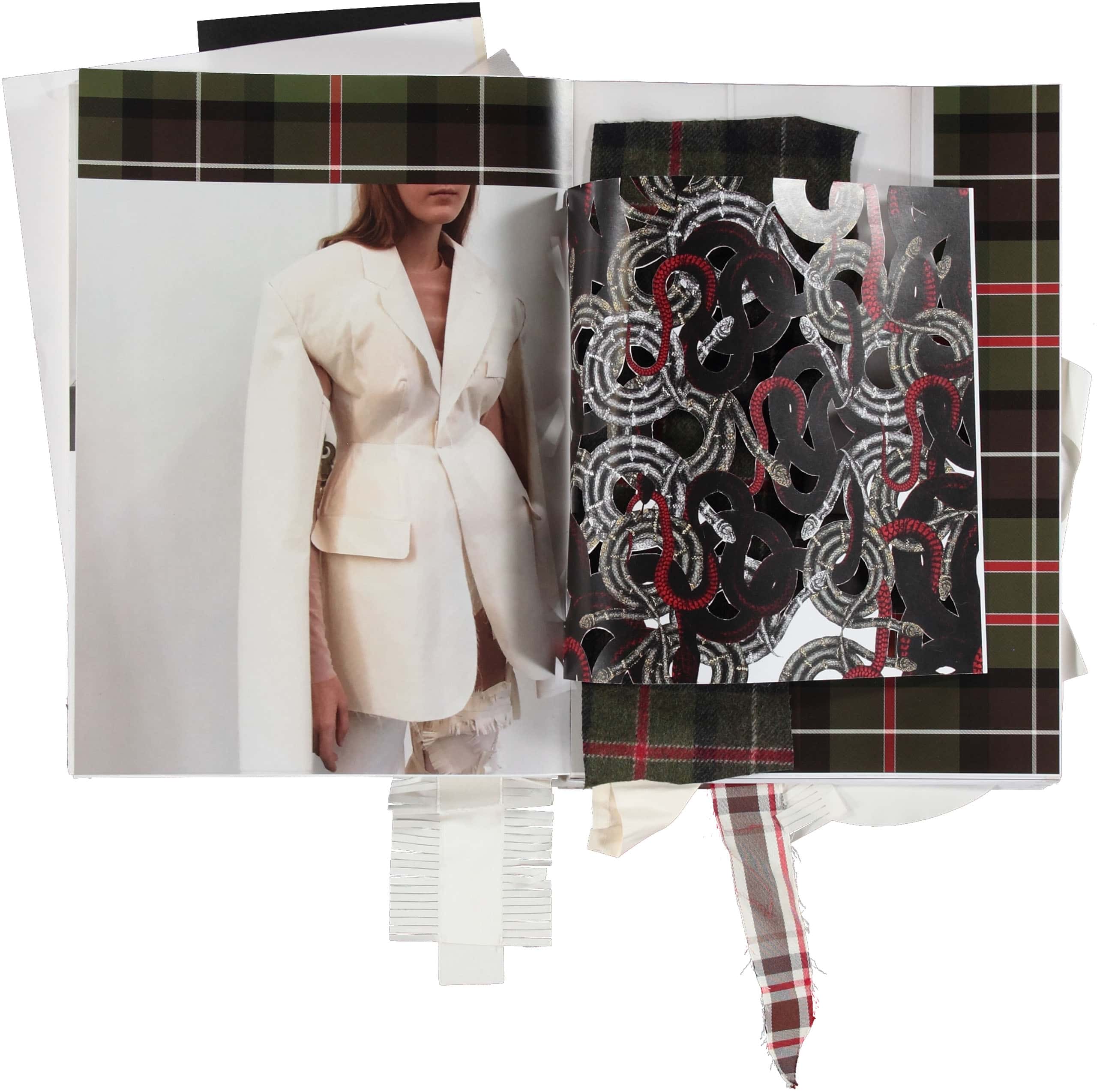 Розворот технічної книги, яка супроводжувала процес створення магістерської колекції в Антверпенській академії. Зліва: фото примірки макета піджака із завищеною талією та вільними рукавами. Справа: зразки тканин і принтів для фінального виробу піджака