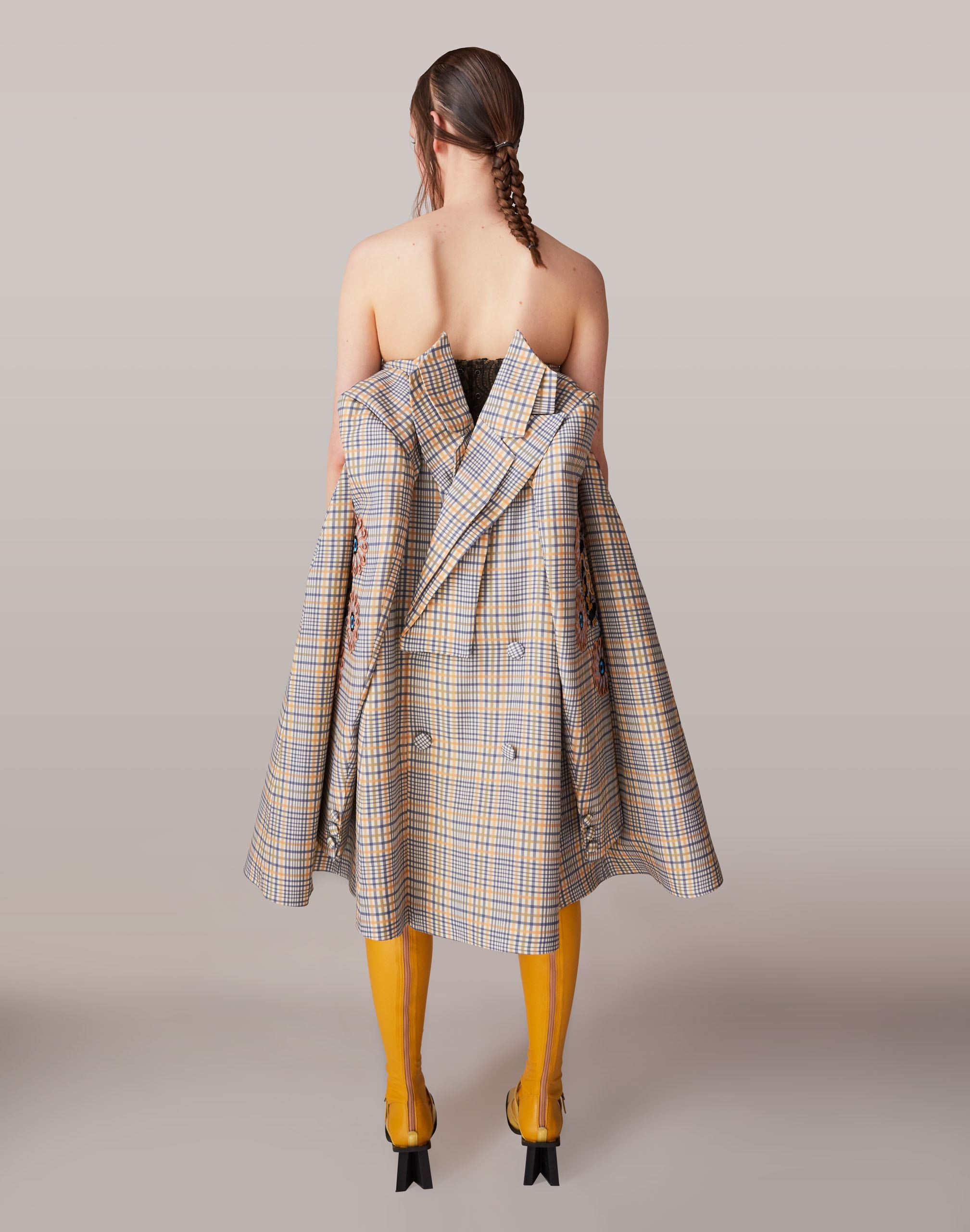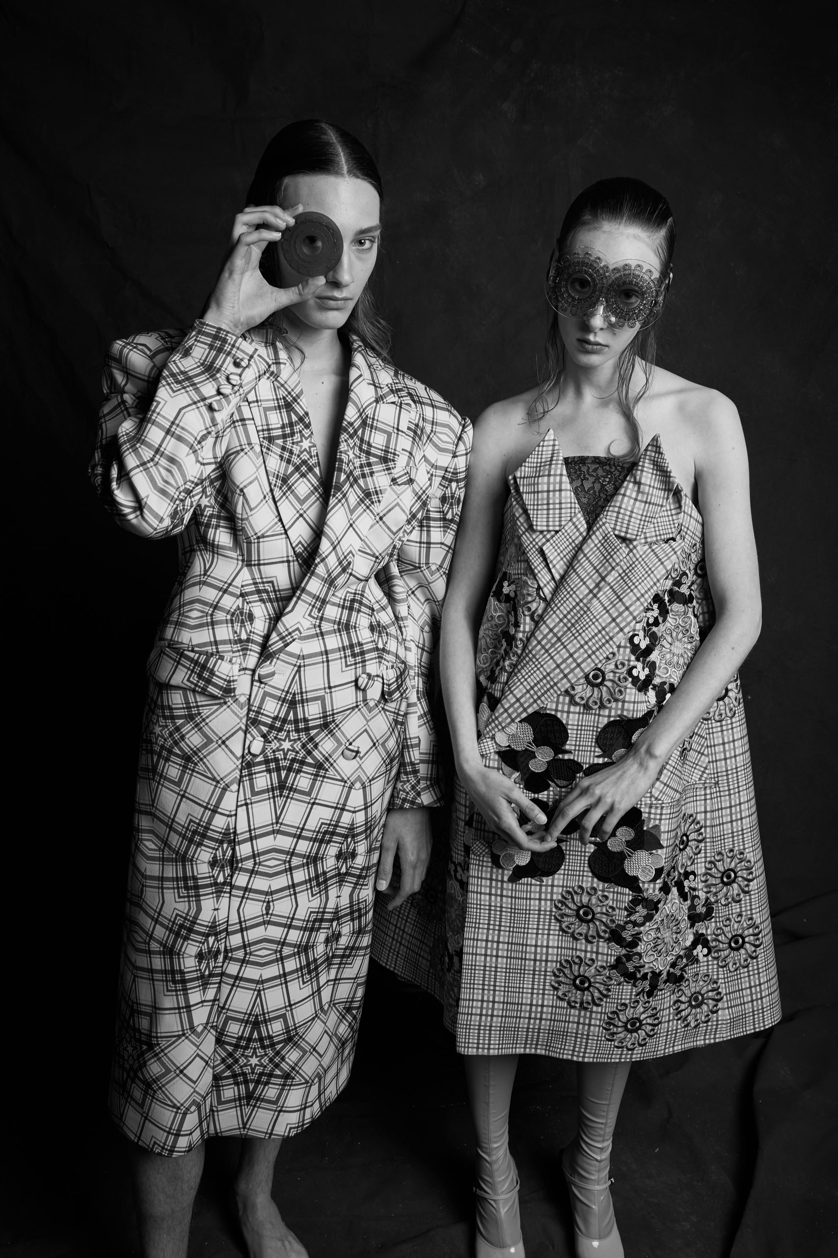 Пальто-калейдоскоп із підплічниками та сукня з ефемерного тартану зі зміїною вишивкою, магістерська колекція Лізи Волосовської в Антверпенській академії