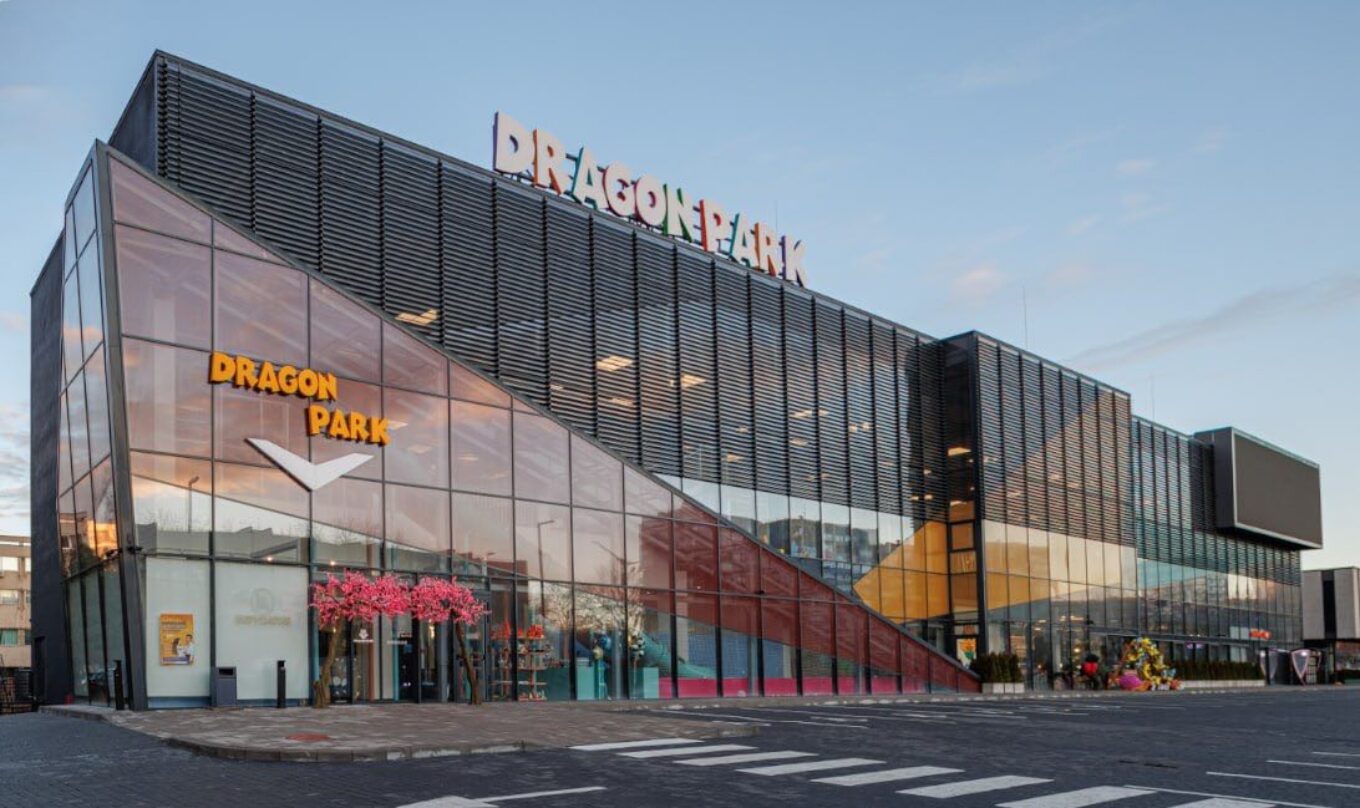Делікатний сонцезахист є органічним доповненням унікального фасаду центру Dragon Park Lviv, який виконано компанією ZFB за технологією впікання фарби у структуру скла. Фото надане компанією ZFB