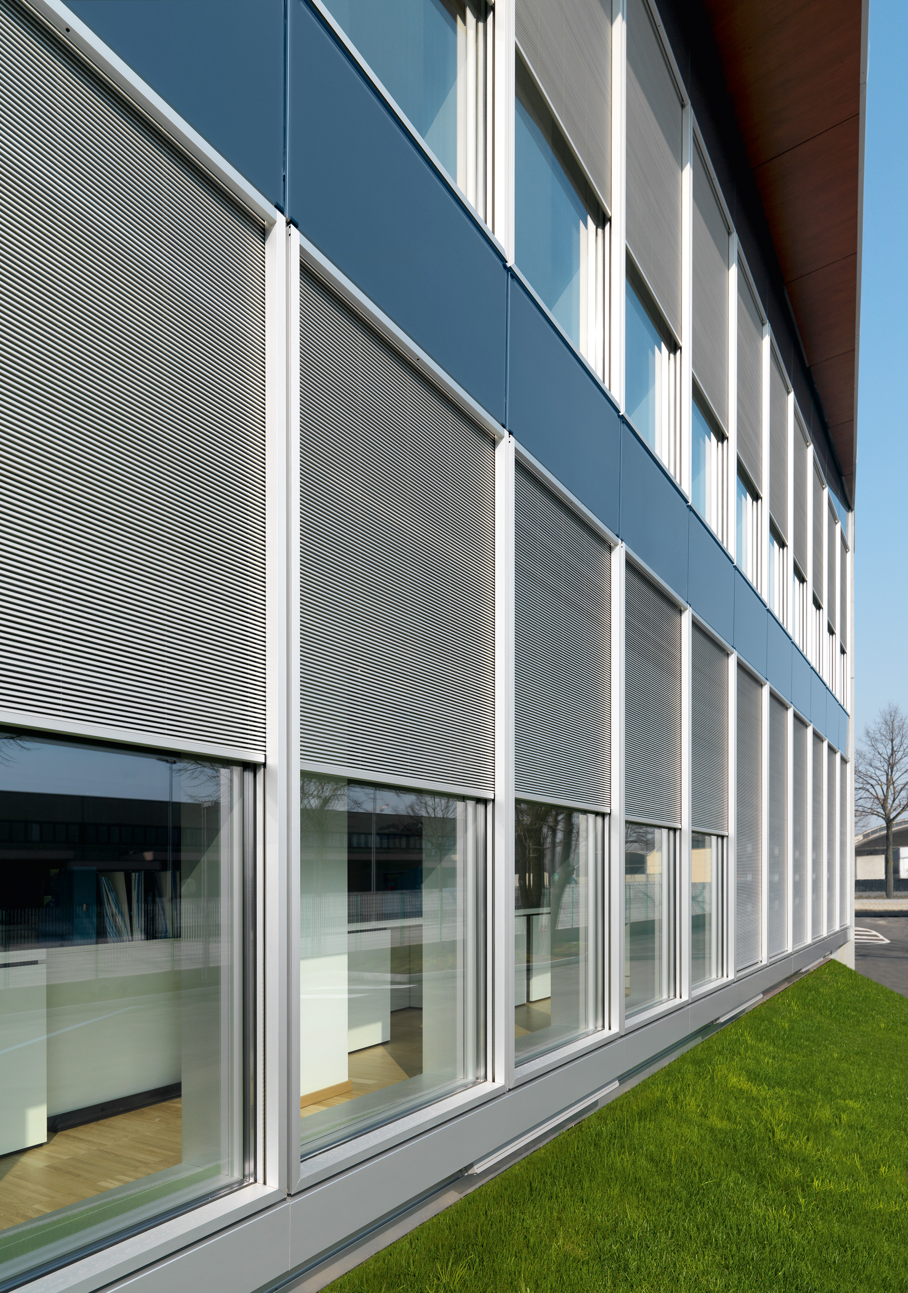 «Архітектор ще на стадії концепції фасаду має врахувати, які саме рішення будуть впроваджуватись, адже інтеграція систем сонцезахисту у фасадну структуру потребує комплексного підходу. Наприклад, під час проєктування зовнішніх ламелей необхідно враховувати кути інсоляції в різні періоди доби та року. Ці дані лягають в основу розрахунків оптимального кута нахилу ламелей і визначають їхні ефективні габарити. Уважний погляд на такі зовнішні конструкції одразу виявляє: тут немає випадкових рішень. Усі кути, форми й пропорції зовнішніх конструктивних елементів підпорядковані суворій геометричній логіці. В її основі — прагнення до оптимального відбиття сонячного випромінювання та забезпечення термічного комфорту для користувачів будівлі. У низці об’єктів ламелі є рухомими й керуються за допомогою електроприводу. Управління здійснюється автоматично через сигнали від сонячних датчиків, що дозволяє системі динамічно реагувати на зміну положення сонця протягом дня. Такі рішення у продуктовій лінійці Schüco мають позначення ALB active (Aluminium Louvre Blades)».