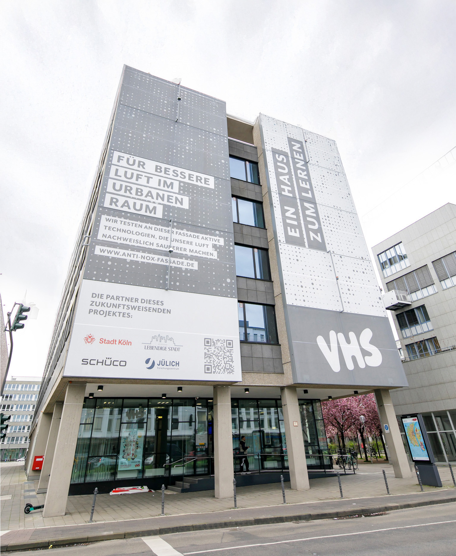 Цей синтез технологій відкриває нові горизонти для багатофункціональних фасадів, які захищають від сонця, а ще генерують енергію чи очищають повітря. Ламелі з вбудованими фотоелементами перетворюють сонячне світло на електрику, скорочуючи вуглецевий слід, а перфоровані панелі гасять міський шум. Вражає інновація Schüco FACID NOX, представлена на виставці BAU 2025 у Мюнхені: текстильні фасади з каталітичним покриттям нейтралізують оксиди азоту, покращуючи якість повітря в містах. Пілотний проєкт запроваджено в Кельні, у співпраці з мерією міста Кельн та фондом Lebendige Stadt. На будівлі центру освіти для дорослих встановили фотокаталітичний фасад. Перший прототип системи вже проходив випробування в Гамбурзі у 2021 році. Протягом двох місяців експлуатації виявили зниження концентрації діоксиду азоту в повітрі на 30%. Завдяки мікроперфорації FACID NOX забезпечує тінь, зберігаючи прозорість зсередини, і легко адаптується до складних форм, що робить його ідеальним для реновацій.