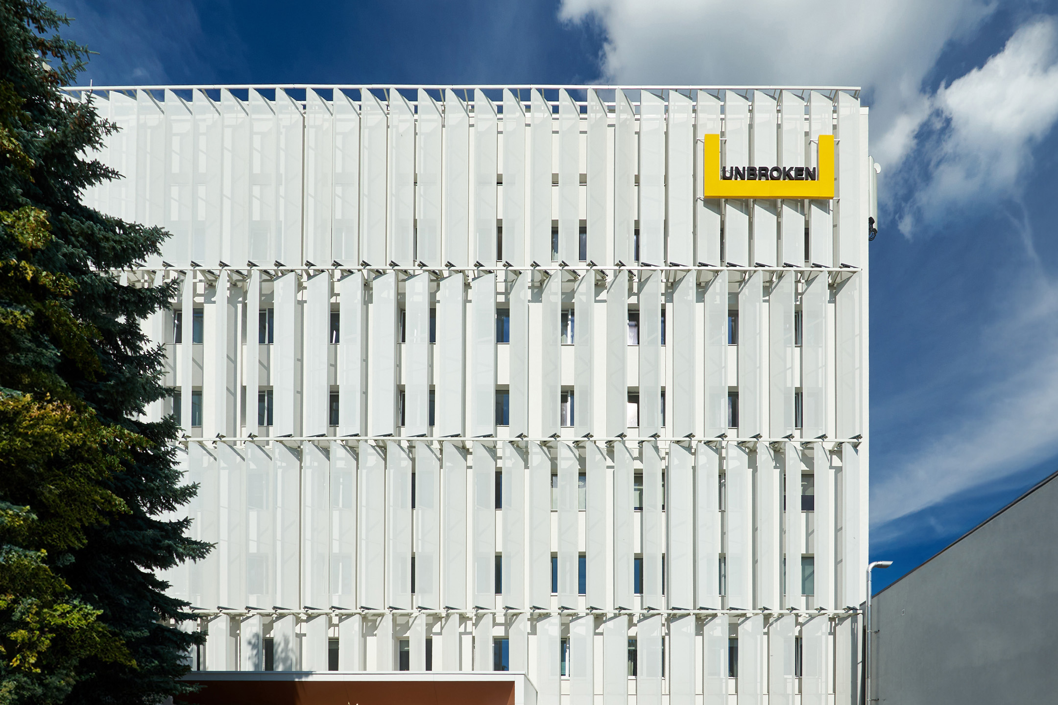 Про виклики й досягнення цього проєкту розповідає Юрій Рубаха, CEO компанії ZFB, яка реалізувала реконструкцію будівлі з інтеграцією сонцезахисних рішень у фасад: «Компанія ZFB має значний досвід роботи з системами Schüco. Однак проєкт Unbroken став для нас новим викликом, адже ми вперше застосували текстильну фасадну систему Schüco FACID. Це вимагало не лише технічного досвіду, а й креативного підходу до інтеграції. Одним із найскладніших завдань було створення спеціалізованого металевого каркасу, який утримує сонцезахисні елементи під різними кутами, формуючи унікальну візуальну концепцію. Ми не просто адаптували систему до фасаду, а вплели її в архітектурну концепцію будівлі, поєднавши функціональність з естетикою. В умовах українського клімату з його спекотним літом і холодними зимами системи Schüco дозволяють нам досягати енергоефективності: влітку вони захищають від перегріву, знижуючи витрати на кондиціювання, а взимку забезпечують контрольовану інсоляцію. Деякі рішення навіть перетворюють сонячне світло на електроенергію, стаючи активним інструментом сталого розвитку. В Україні ми часто стикаємося з нетиповими завданнями, і наш підхід — це індивідуальні рішення, які гармонізують функціональність, естетику та кліматичні особливості».