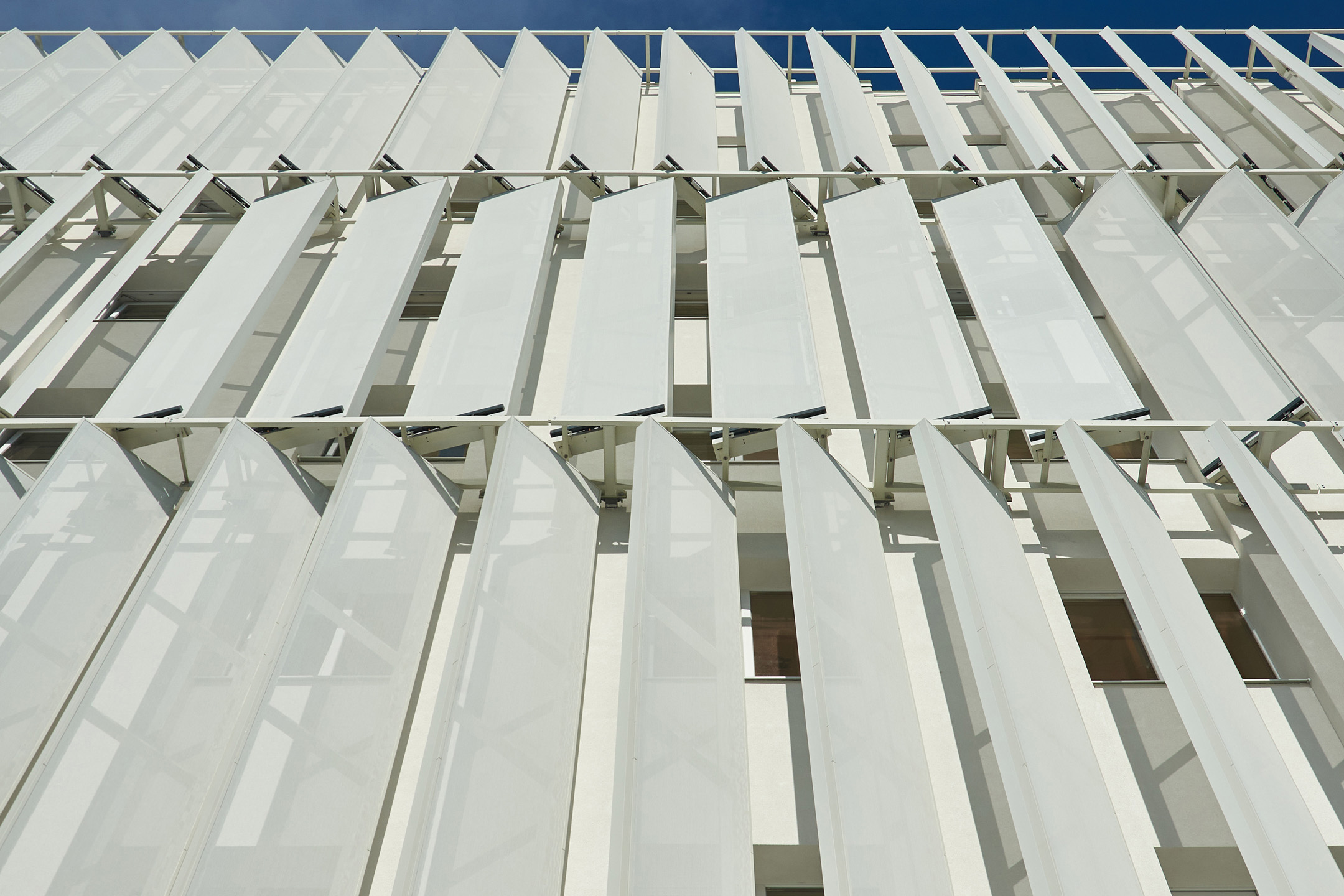 Свіжий приклад інтеграції пасивних і активних рішень — затінення в багатоквартирному комплексі DC Tower 3 у Відні, спроєктованому Dietrich | Untertrifaller Architekten та реалізованому Alu-Sommer GmbH. Фасадна система Schüco FWS 50 із вбудованими вертикальними ламелями забезпечує пасивний захист, блокуючи надмірне сонячне випромінювання та зменшуючи теплопритоки. Активні елементи, зокрема автоматизовані зовнішні жалюзі Schüco ALB, динамічно реагують на зміну кута сонячних променів, забезпечуючи до 23% затінення та оптимізуючи природне освітлення.