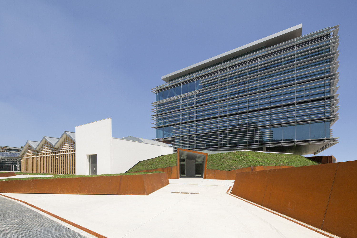Елементний фасад Schuco USC 65 із горизонтальними плавцями-ламелями дозволяє співробітникам корпоративного кампусу La Forgiatura в Мілані комфортно почуватися навіть у спекотні літні дні. Фото: Stefano Topuntoli