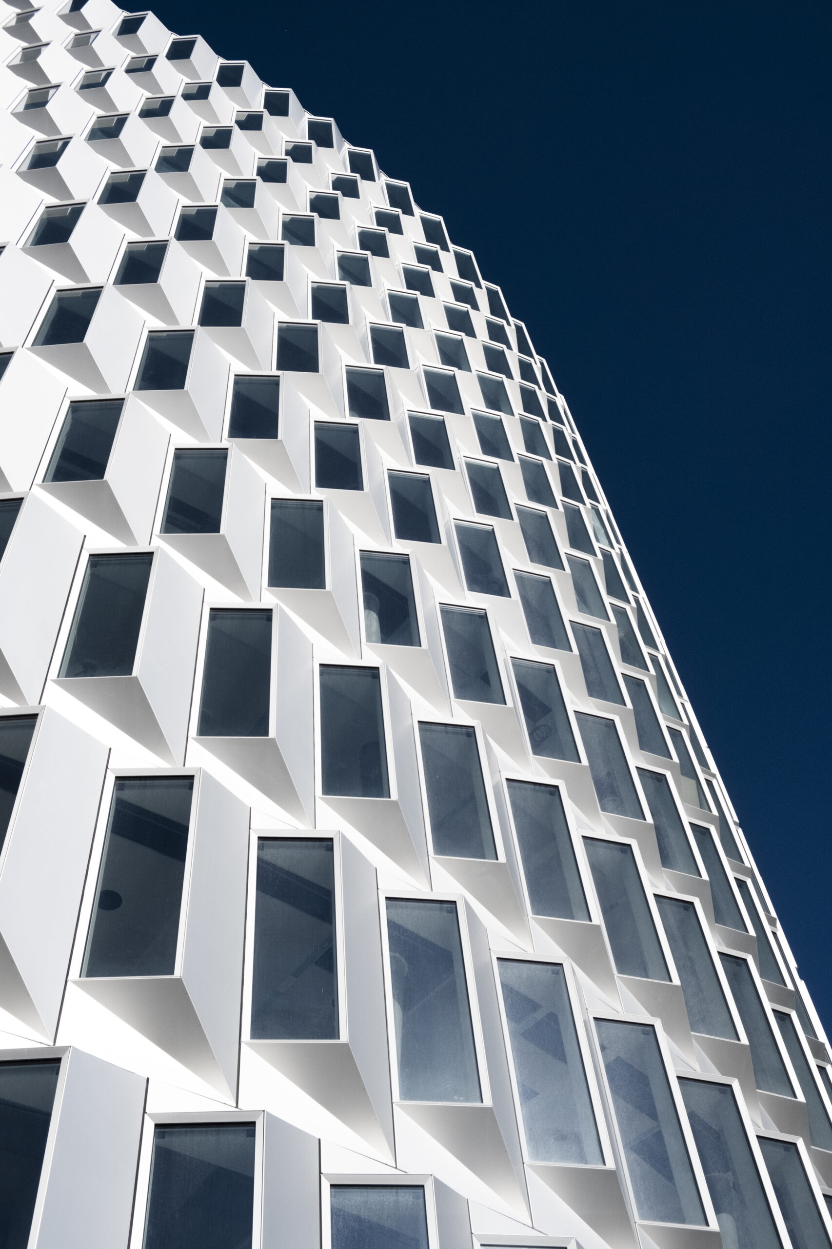 Нова офісна будівля Tip of Nordø в Копенгагені, реалізована командою архітекторів Cobe, Vilhelm Lauritzen Architects і Tredje Natur, є прикладом інноваційного підходу до управління світлом і теплом. Циліндричний фасад змонтований на базі системи Schüco FWS 50 із модульними елементами. Він спроєктований після ретельного аналізу сонячного випромінювання в гавані Нордхавна, що забезпечує оптимальний баланс між природним освітленням і захистом від перегріву. Вужчі елементи на західній, південній і східній сторонах зменшують відблиски сонця, тоді як північна частина фасаду відкривається для панорамних краєвидів Ересунна. Ця динамічна структура мінімізує теплопритоки й створює виразний архітектурний образ.