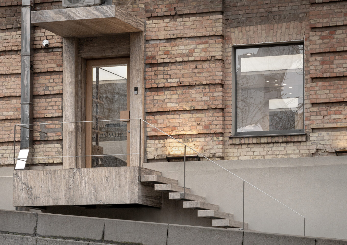 Вулиця має значний нахил, і вхід до салону представлений навісним ґанком зі сходами. Вхідна група має облицювання плитами з натурального каменю. Травертин, який ми також зустрінемо в інтер’єрах салону, покриває сходи, платформу ґанку, а також портал із навісом, що обрамляють вхідні двері. Обраний камінь має унікальний малюнок, що водночас звертає на себе увагу та перегукується зі стінами будівлі.