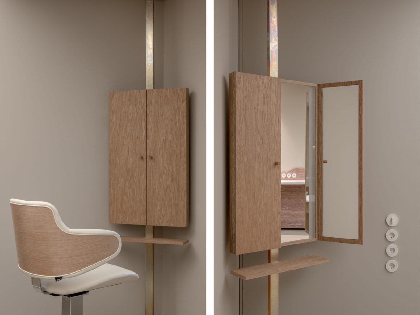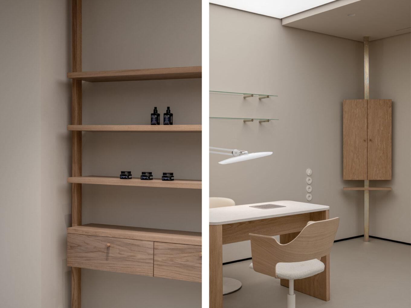 Загалом інтер’єри салону витримані у витонченій манері мінімалізму, такій характерній для Ріни Ловко та проєктів її студії. Навіть обов’язкові для роботи елементи салону мають у дизайн-проєкті свій особливий візуальний шарм. Так, наприклад, дзеркала для візажистів виконані з дубового шпону у вигляді традиційних трюмо. Таке рішення додає затишку й римується з вінтажними кріслами. Дзеркала мають додаткове освітлення, а їхні стійки виконані з металу під гальванічним покриттям з його характерними кольоровими розводами. Дерев’яні меблі та масажний стіл виконані у шпоні дуба, чий природний відтінок максимально гармонійно поєднується з обраним для оздоблення стін салону пісочним кольором.