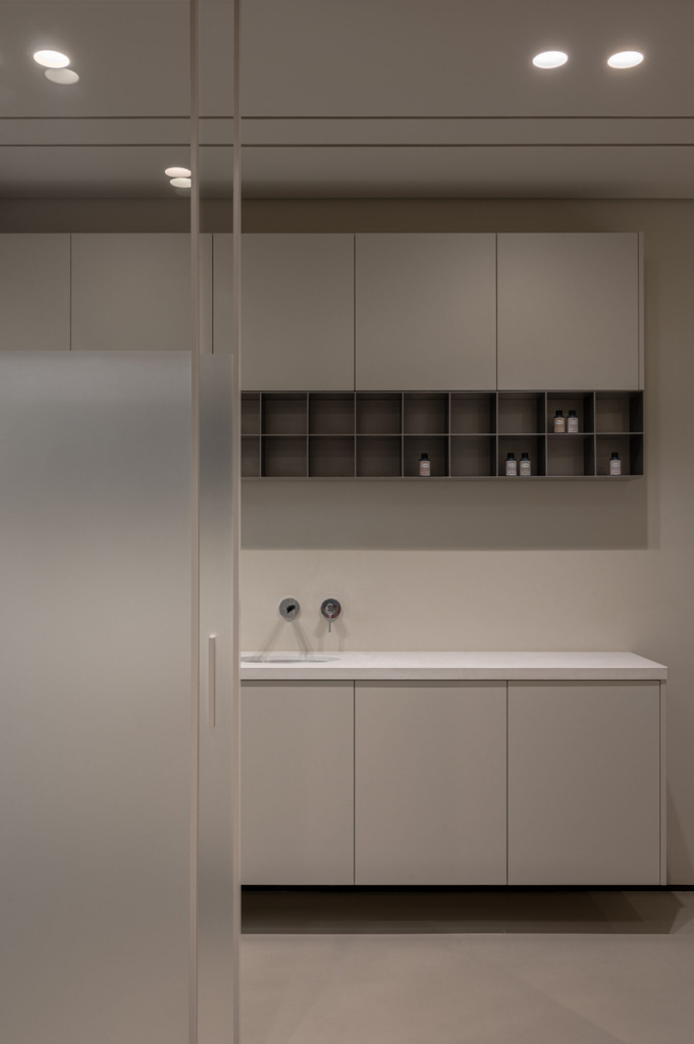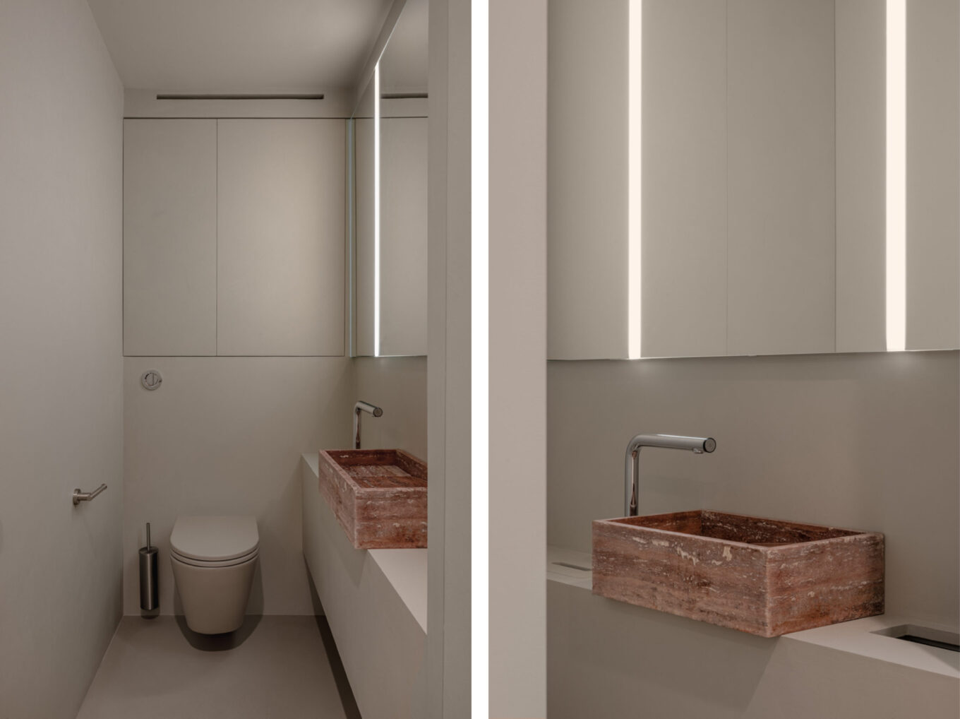 Санвузол салону виконаний також у мінімалізмі з натуральними акцентами. Його інтер’єр витриманий у простих формах, унітаз був підібраний у тому ж кольорі, що й оздоблення стін, а раковина зроблена з травертину — того самого, що був використаний в оздобленні центральної стіни салону.
